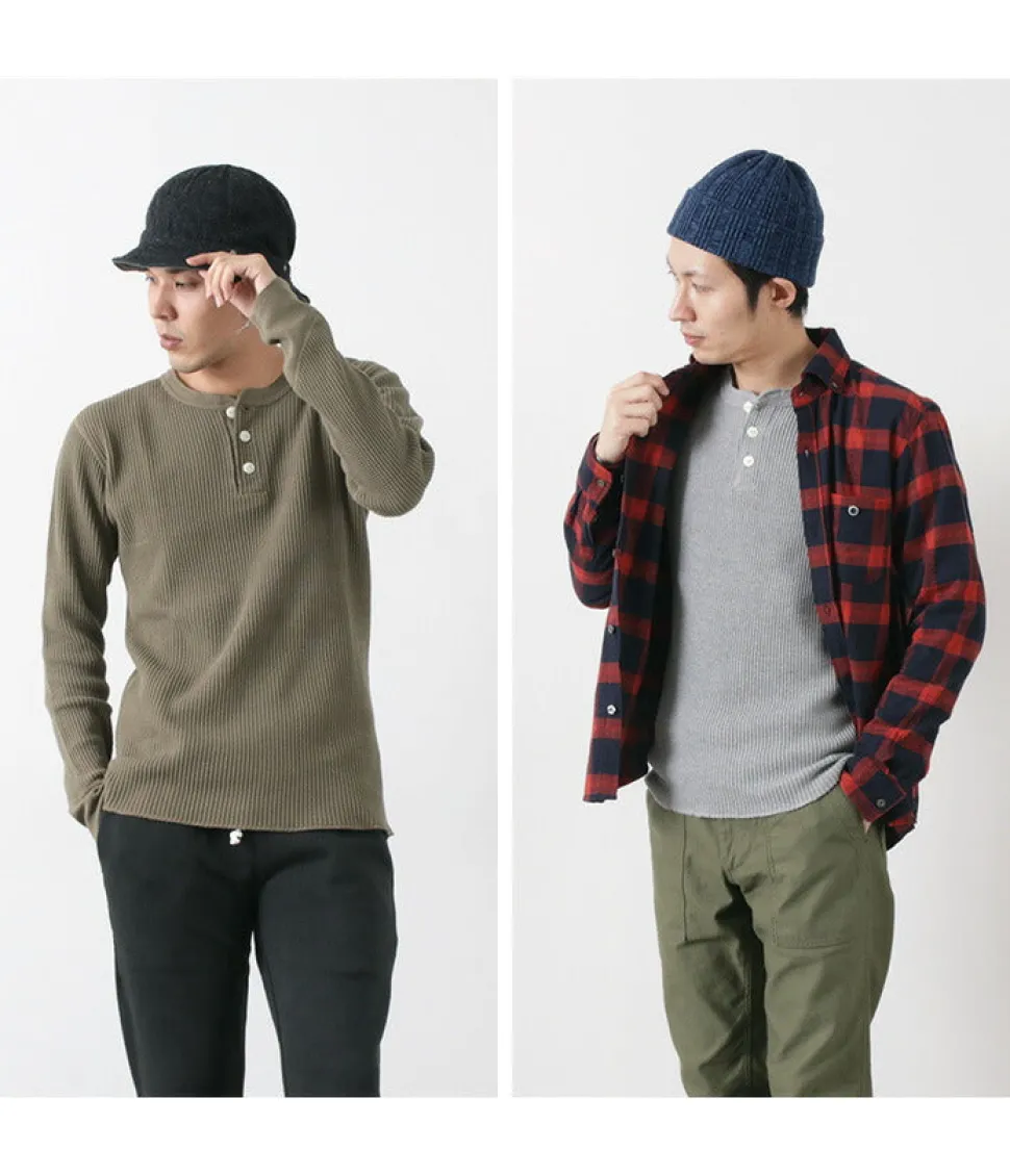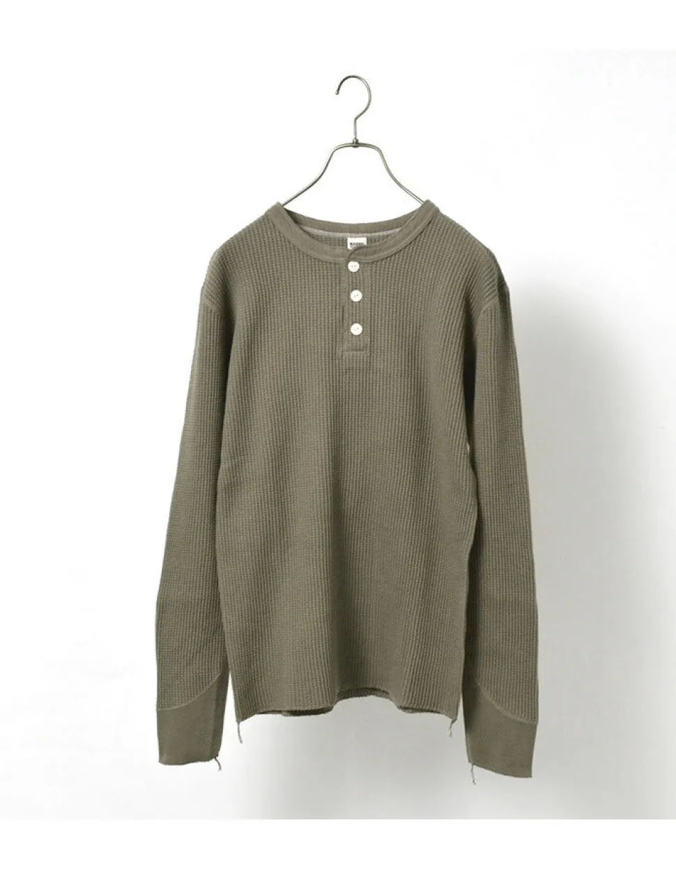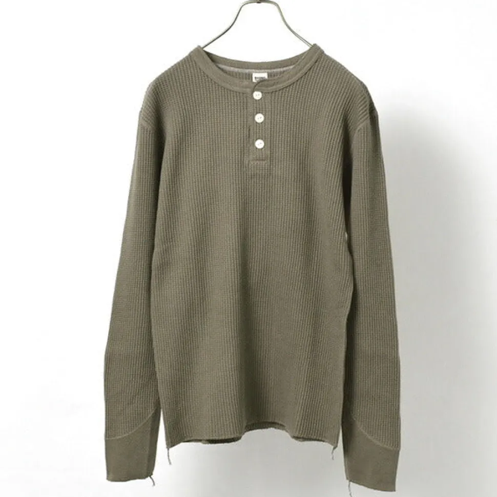 Thermal TeeBARNS Henley Neck T-Shirt is made from our classic Big Waffle fabric. It is originally a thermal with a strong connotation of underwear, but this item can be enjoyed simply as a single piece due to the thick fabric and detailing. Of course, it is also comfortable to wear as an inner layer, because it is also excellent for keeping out the cold. Also available in ROCOCO special order colours! The trendy and calm khaki colour is an original colour specially ordered by ROCOCO. The khaki colour is a trendy and subdued color, which is available only here.