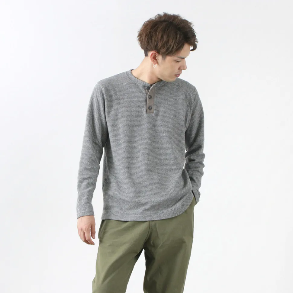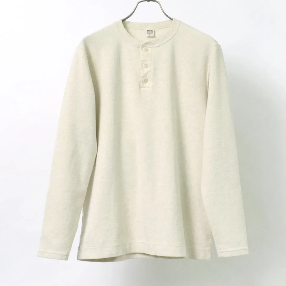 All-around henley-neck T. This henley-neck T-shirt is made of Barnes’ heavy spun milling fabric, specially ordered by ROCOCO. The design is made with attention to detail and the stretchiness and fit unique to spun milling fabric are combined to create an all-around great finish. You can wear it as you like, with the front placket zipped open for a relaxed look or tightly closed for a classy look, which will greatly expand your coordination. Unusually thick spun milling fabricThe heavyweight fabric, which is rare in spun milling fabrics, is made of No. 20 single yarn, and has a fit that wraps around the body. Spun milling fabric is a knit fabric with elastic knitting and features excellent elasticity and moisture absorbency. Polyurethane is blended into the fabric to add kickback properties, making it a durable fabric that is hard to damage even when washed with a lot of gunpowder.
