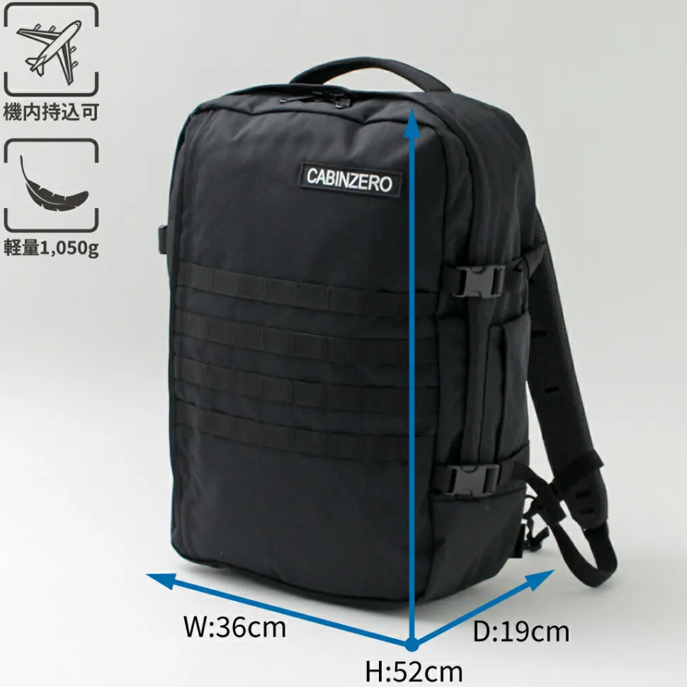 Features models with ample cabin size capacity, designed for carry-on regulations. Despite its large capacity, the MILITARY 44L weighs only 1,050g, allowing for hassle-free packing without worrying about baggage weight.