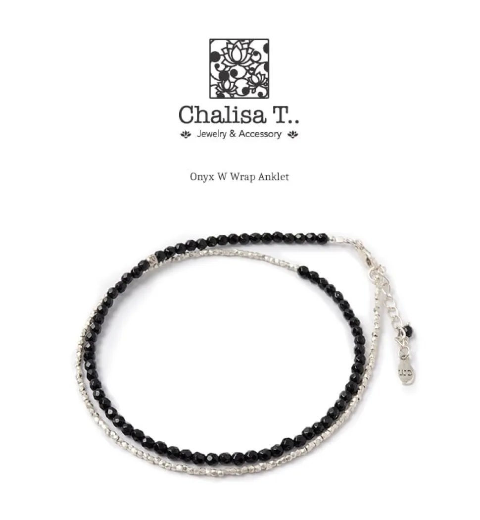 Onyx and Karen Silver W-Wrap AnkletThis W-wrap anklet combines the beautiful black, luxurious onyx cut beads with warm Karen silver. The two types of beads are well-balanced and create a sense of sophistication. The two types of beads are well-balanced and create a sense of sophistication, and the Karen silver incorporated between the onyx beads is an accent. Onyx is very popular in Japan because of its gentle presence that gives a sense of calm and security. Onyx has been valued since ancient times as a stone to ward off evil and bad spirits. Many people wear onyx as a stone that guides them to take steady actions to realize their goals.