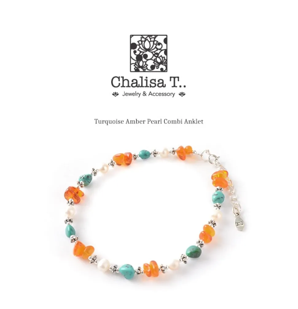 This anklet is a balanced combination of turquoise, amber and fresh water pearls. The combination of turquoise, amber and fresh water pearls gives the anklet a stylish look, even though they all have a strong personality on their own. The use of amber, which is rarely seen in casual accessories, gives the brand its own colour. Amber