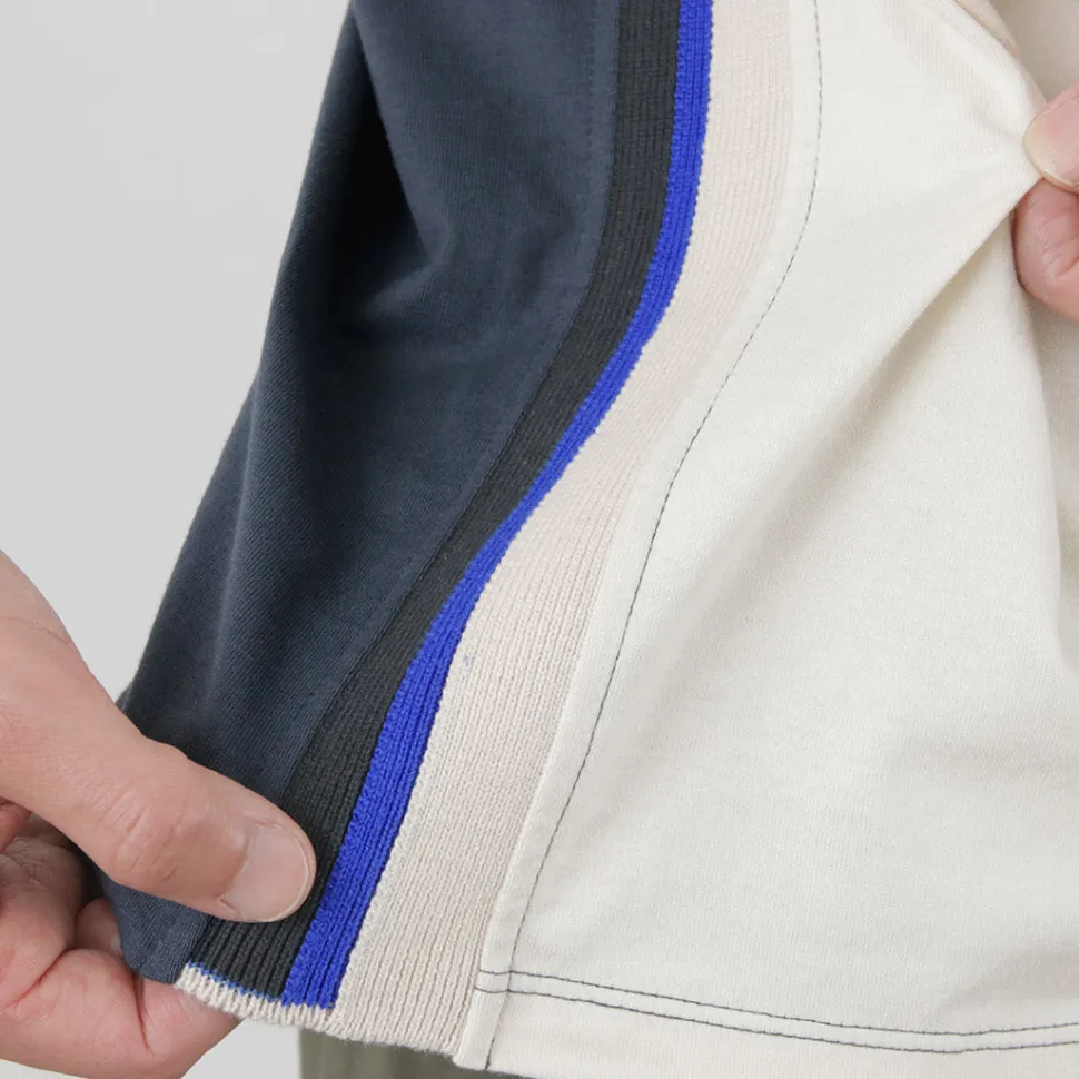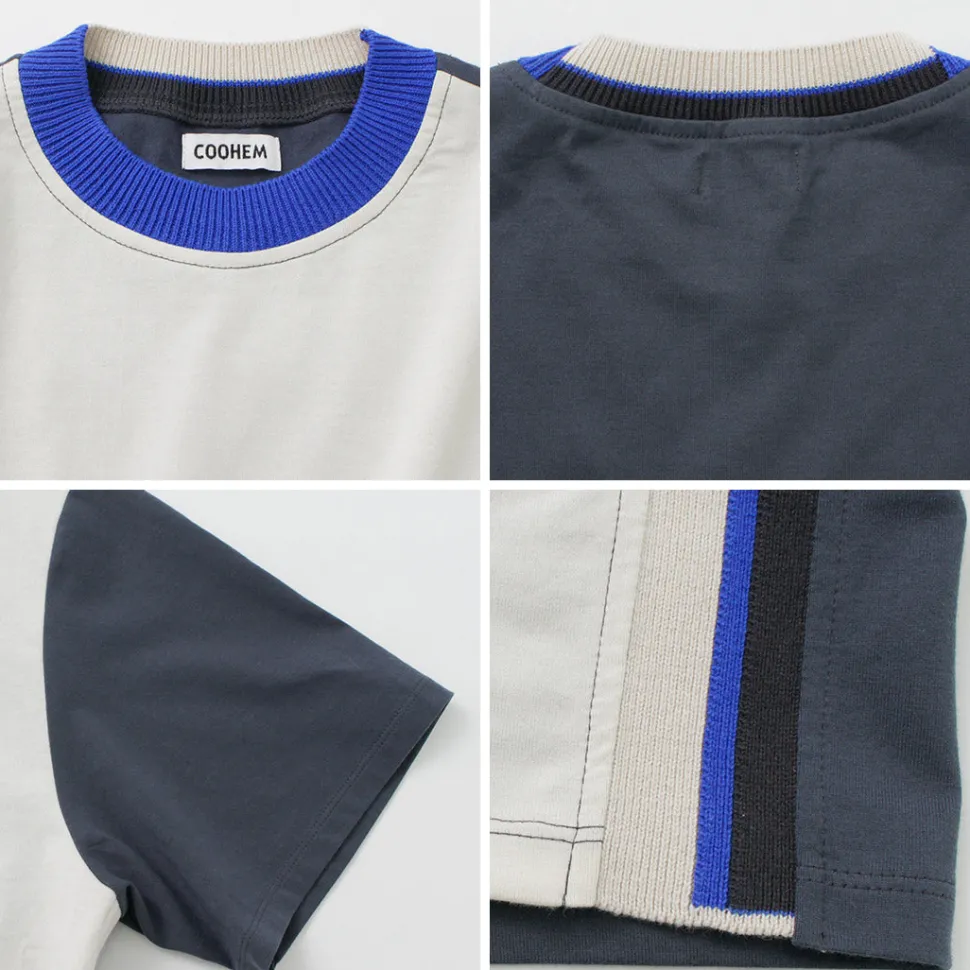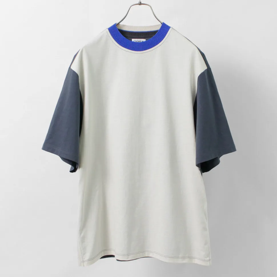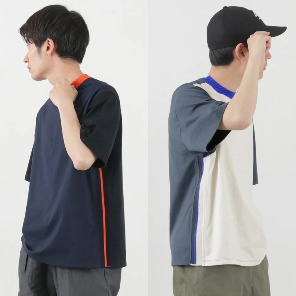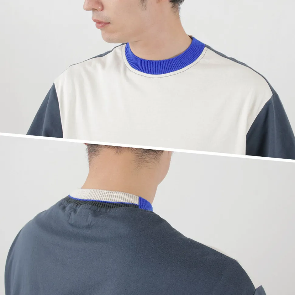 The body has a color block finish, combining different colored fabrics on the front and back. The appeal of this item is that it has a different atmosphere from printed T-shirts and patterned items.