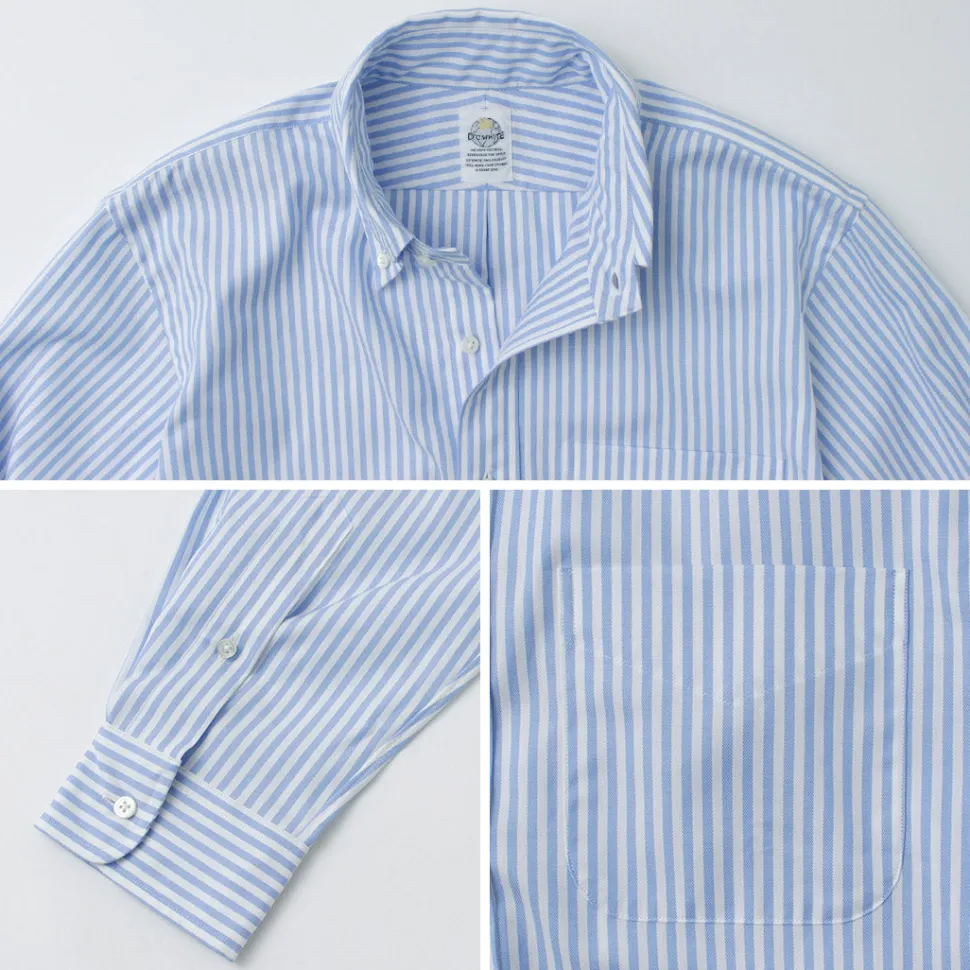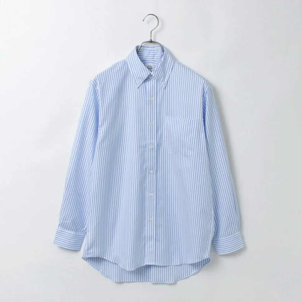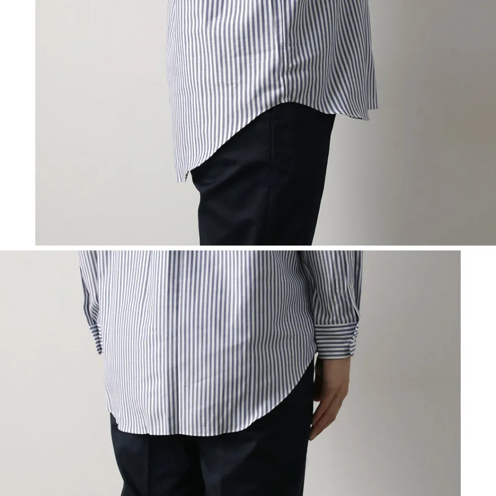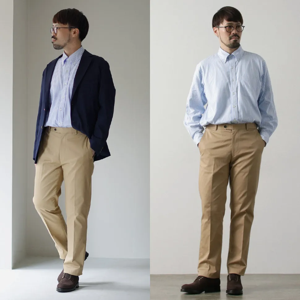 The collar features a simple button-down style, designed to be worn as an inner layer under jackets. The collar’s fit ensures it maintains its shape when worn with a tie. Additionally, the shirt is sewn with finer stitches than casual shirts, giving it a more sophisticated look. Even the buttons are sewn with a root winding method for added strength—showing attention to detail even in hidden areas.