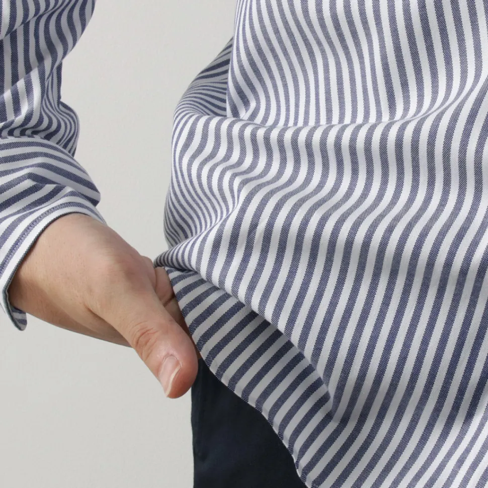 The fabric is made of pin-ox, which is woven with finer yarns than usual. The sizing around the neck, the stitching work, and even the sewing of the buttons are all carefully considered.