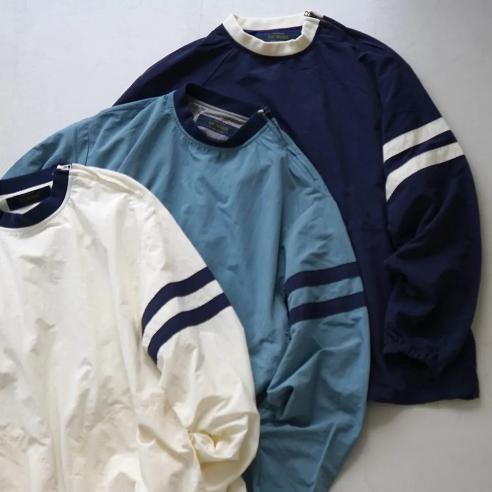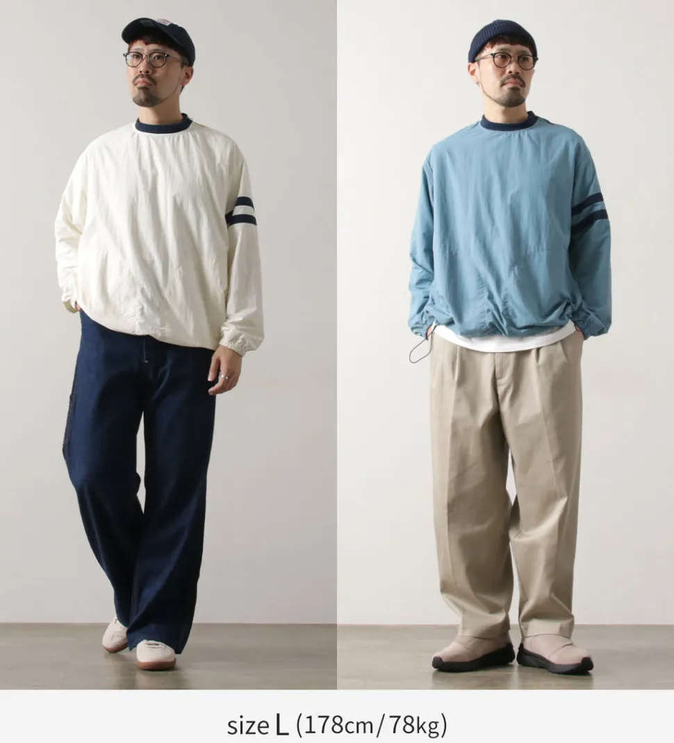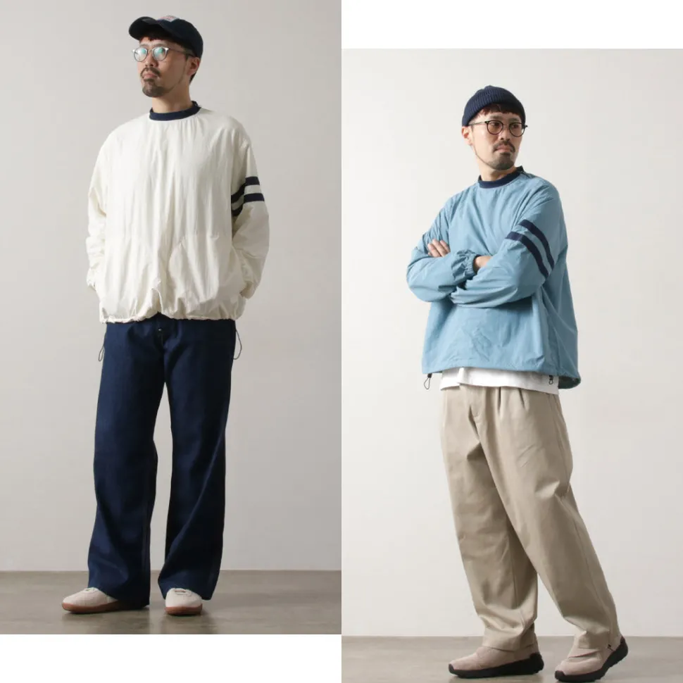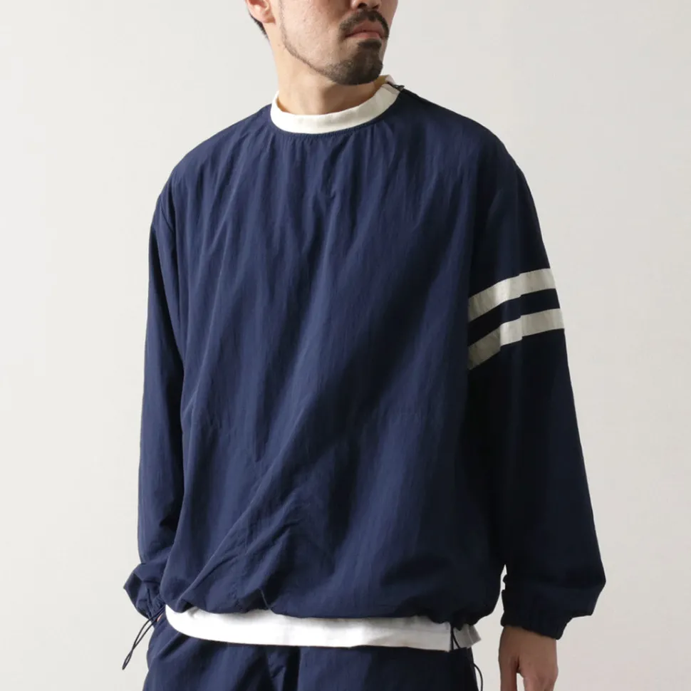This item was created with the image of a product sold at the Ivy League university co-op store in the 1960s. The natural creased nylon cloth, the ribbed neck and the line design on the sleeves give this item a nostalgic feel.