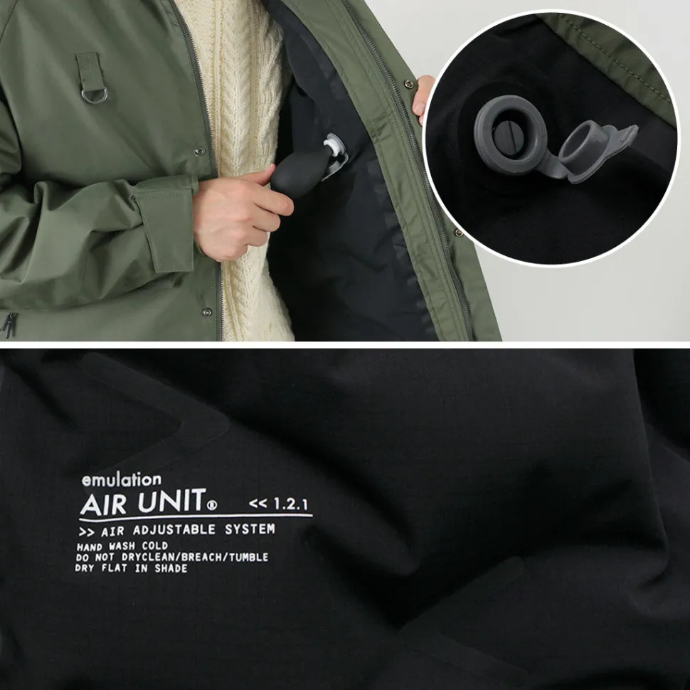 down and padding is not due to the material’s heat shielding properties, but to the layer of air created by the puffiness of the material. Compared to down and cotton jackets, where the air layer collapses with the movement of the wearer and allows heat to escape, emulaion’s AIR UNIT is a ‘better insulating item’ as the air inside the unit does not move at all and does not leak outwards.