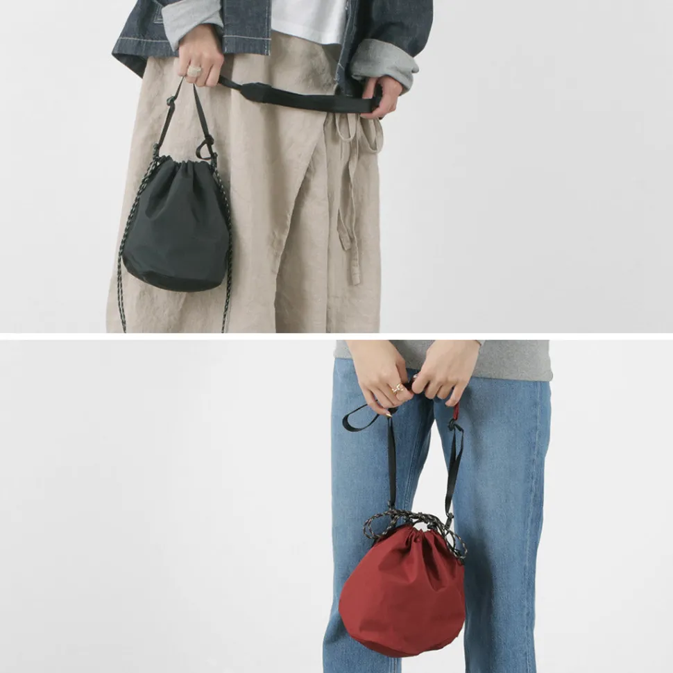 It can be worn diagonally over the shoulder, around the neck like a neck strap, or as a drawstring pouch by removing the strap. It can also be used as a drawstring pouch by detaching the strap.
