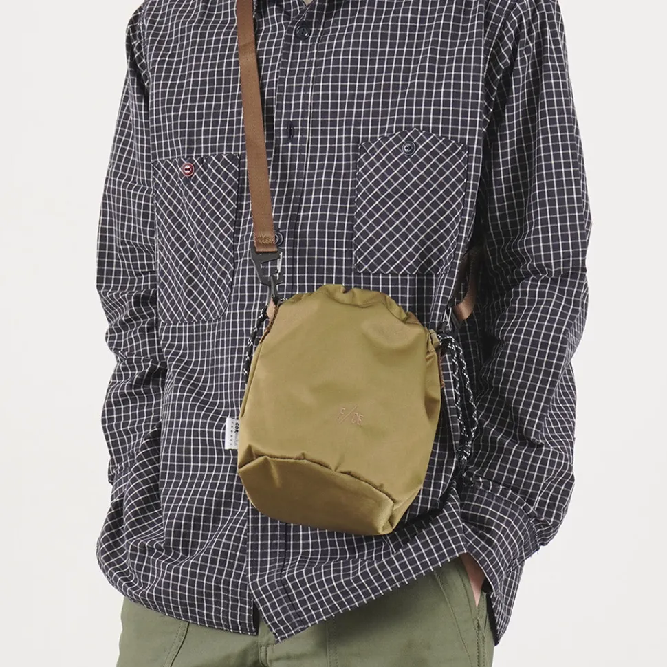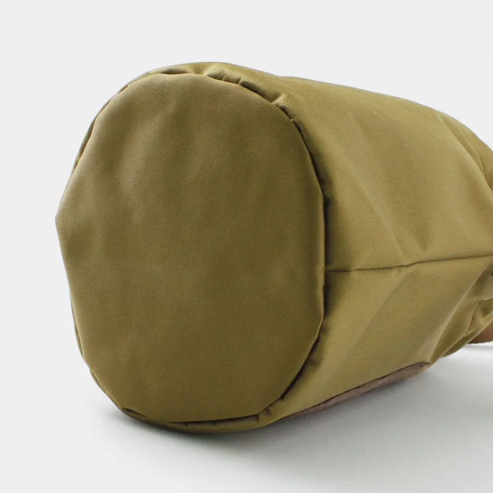 This drawstring shoulder bag is inspired by the chalk bags used for climbing and bouldering. The fabric is the world’s first “Cordura nylon satin,” which was developed in collaboration with INVISTA. This fabric is highly durable, yet has an elegant satin texture. The compact size is perfect for a quick trip to the shops, a festival, or a trip to a destination.