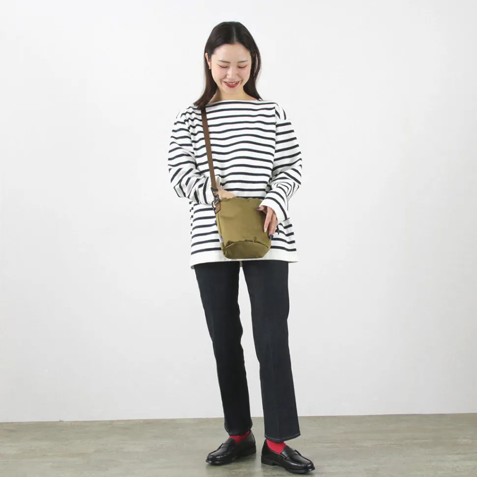 This drawstring shoulder bag is inspired by the chalk bags used in climbing and bouldering. The fabric is the world’s first “Cordura nylon satin,” which was jointly developed with INVISTA. This fabric is highly durable, yet has an elegant satin texture.