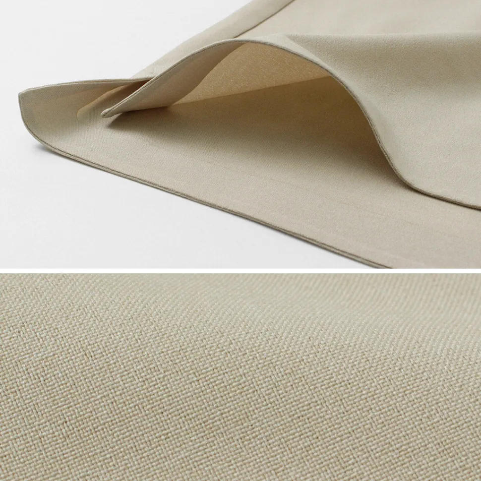 A breathable, medium-thick polyester fabric with the look of tropical wool is used. It has a crisp, dry feel against the skin and can be worn comfortably during the spring and summer seasons. In addition, it also has a stretchy property that stretches in two directions for a comfortable and relaxed fit.