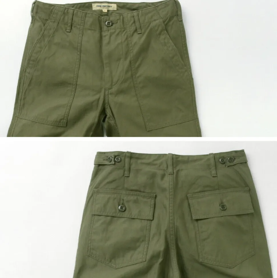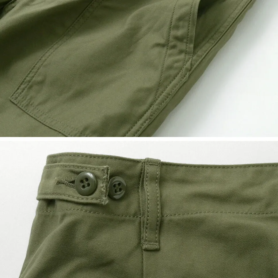 These pants are a modified version of the 1950s American military fatigue pants. Retaining the rugged details of military design, they feature a beautiful silhouette that tapers toward the hem.