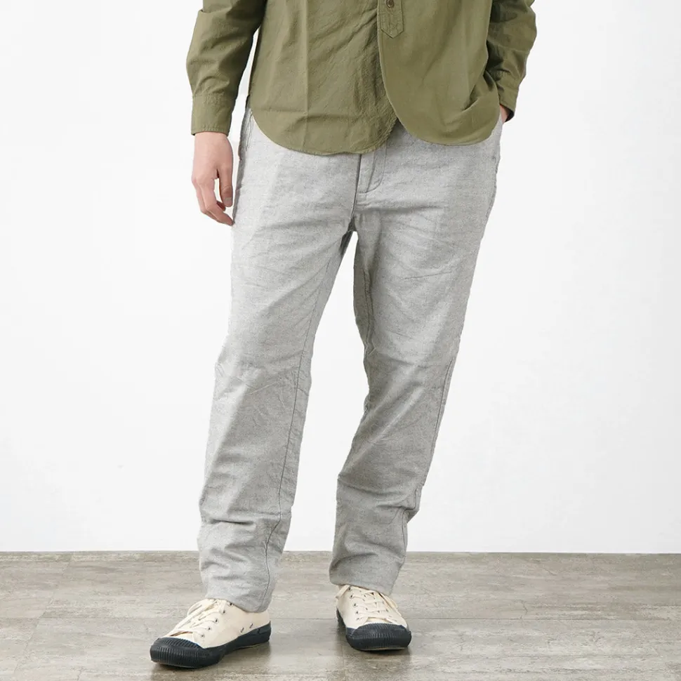 One made of FOB FACTORY’s original chambray fabric. The pants are finished with a simple design that evokes a good old-fashioned atmosphere. In addition, the softness of the gauze-like double weave and the dry touch of linen on the skin are distinctive features. The silhouette is set in a slim tapered shape with a timeless design that does not depend on the person who wears them. The silhouette is slim and tapered, making it an easy-to-use item that is also easy to coordinate.