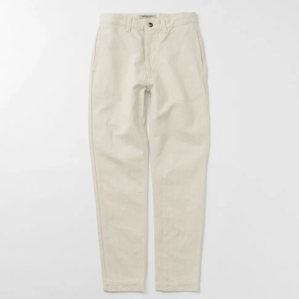 The original hemp-blend herringbone fabric with a cool feel on the skin and a rough look is used. With a tapered silhouette that can be worn just right or oversized, these trousers work well with a wide range of styles, from clean to casual.