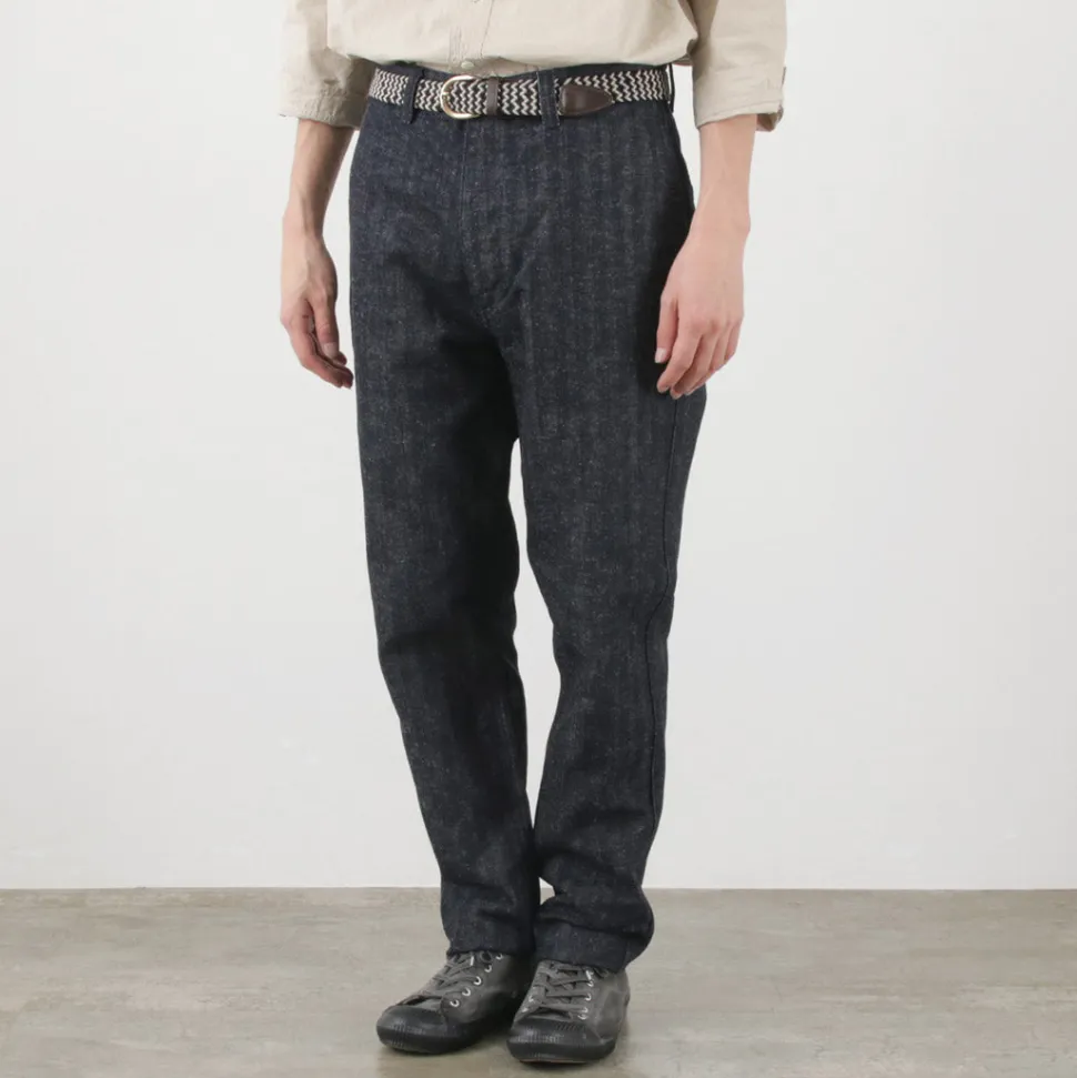 The original hemp-blend herringbone fabric has a cool feel on the skin and a rough look. With a tapered silhouette that can be worn just right or oversized, these trousers are ideal for a wide range of styles, from clean to casual.