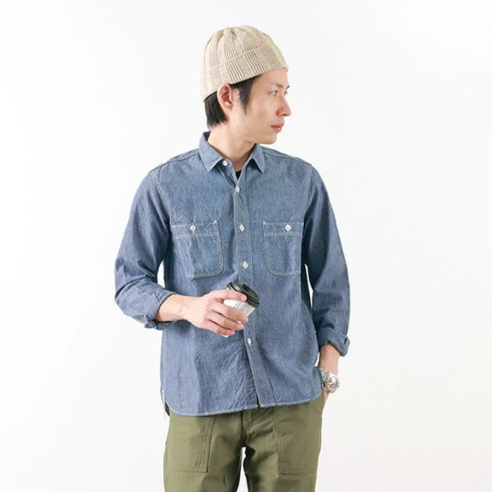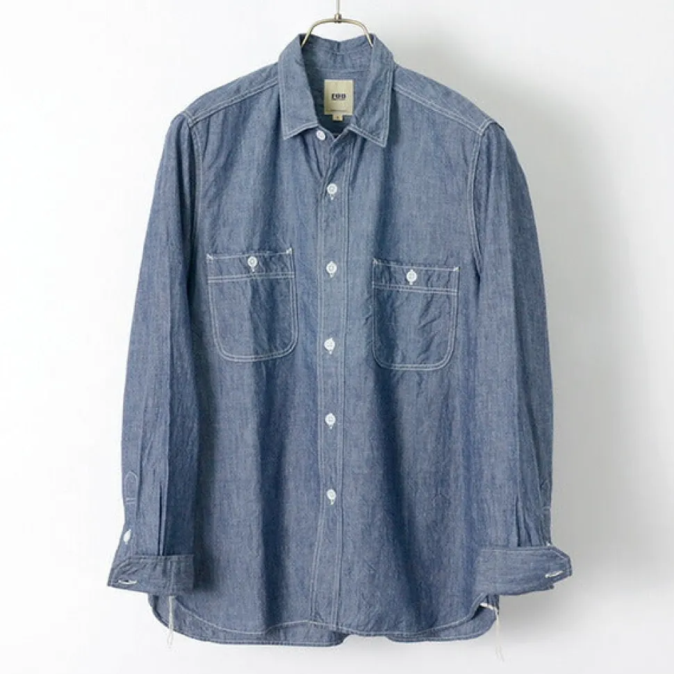 Tight and clean silhouette, in keeping with the work shirts of the 40’s, this adult work shirt has a clean and simple silhouette. FOB’s original Selvic Chambray is woven on an old-style power loom at a tension as close to hand-weaving as possible, slowly and carefully, so you can feel the original texture of the cotton, the rustic look with unevenness, and the natural rough feeling. The selvic is used on the gusset of the shirt as a point of reference. Selvic is used in many places on vintage shirts because it does not unravel. Details & PartsThe collar is a little smaller so that it looks nicer when layered. The main stitching is double stitching. The buttons are the plate buttons that were common in the 40s and 50s. The double pockets without flaps are also a detail of that time.