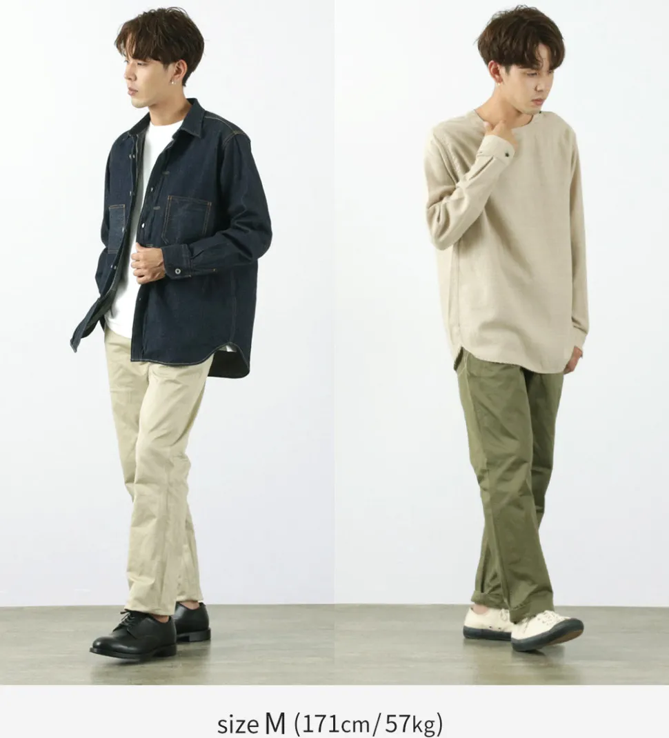 Based on the U.S army Chino trousers, details such as ball-rimmed pockets and rolled seams are reproduced and fused with a slim, clean silhouette typical of F.O.B FACTORY. A brand new pair that can be worn with any outfit.