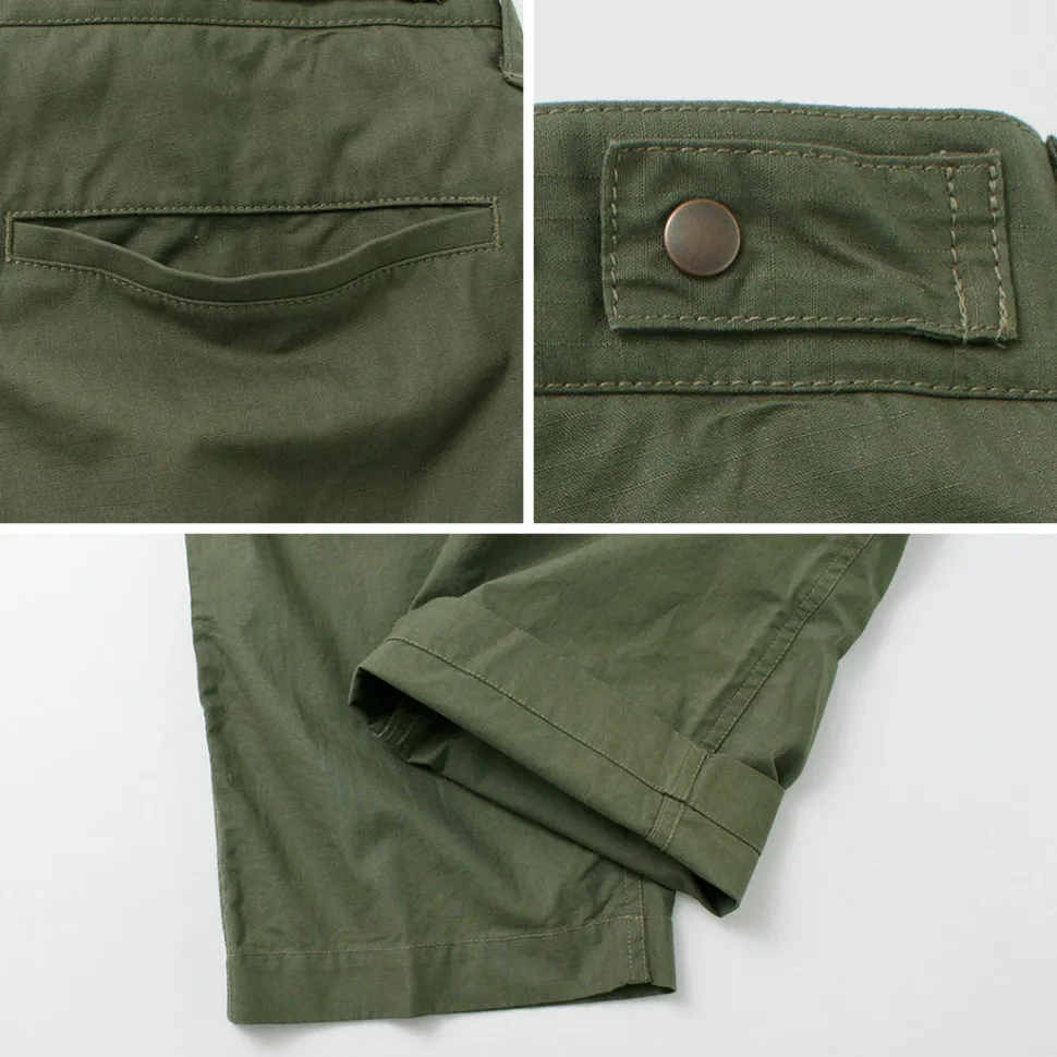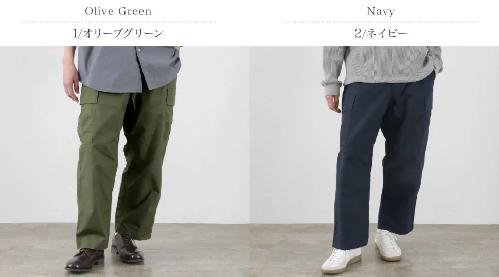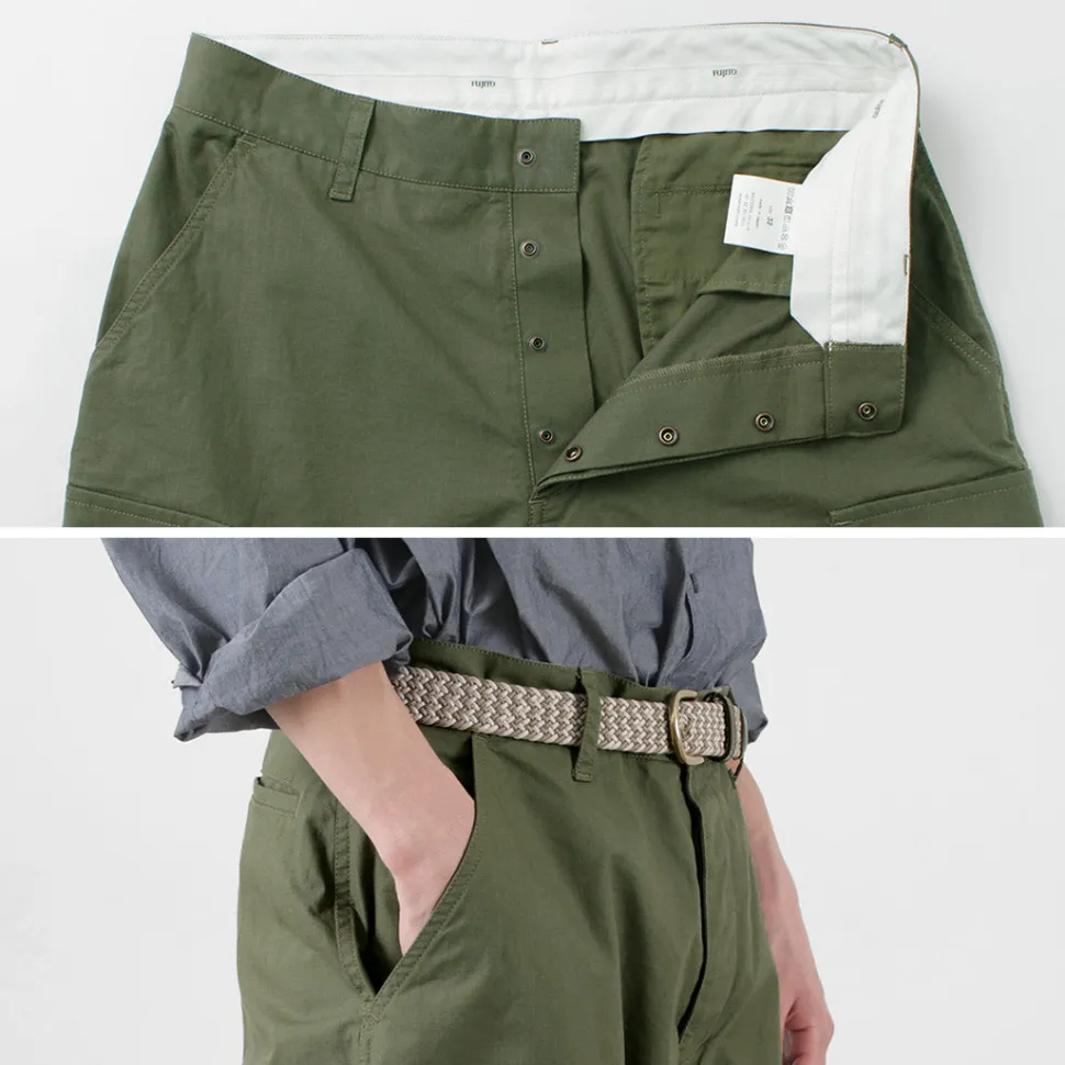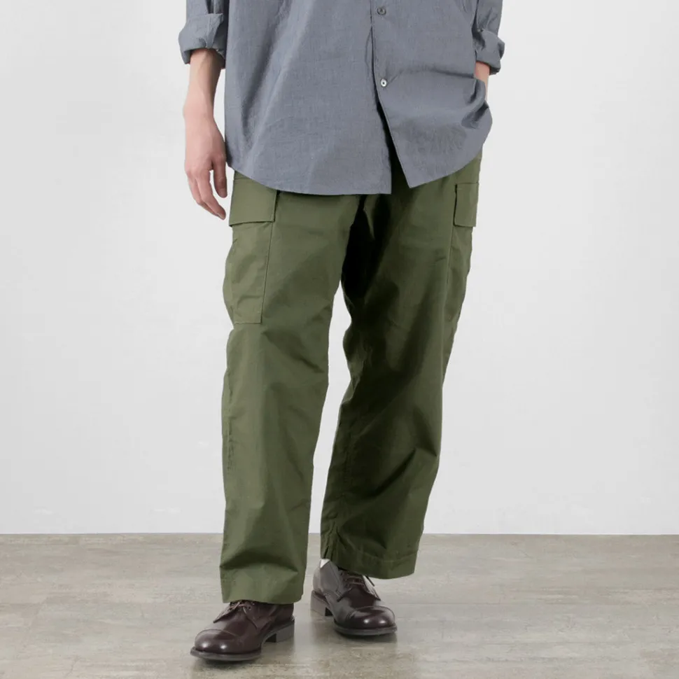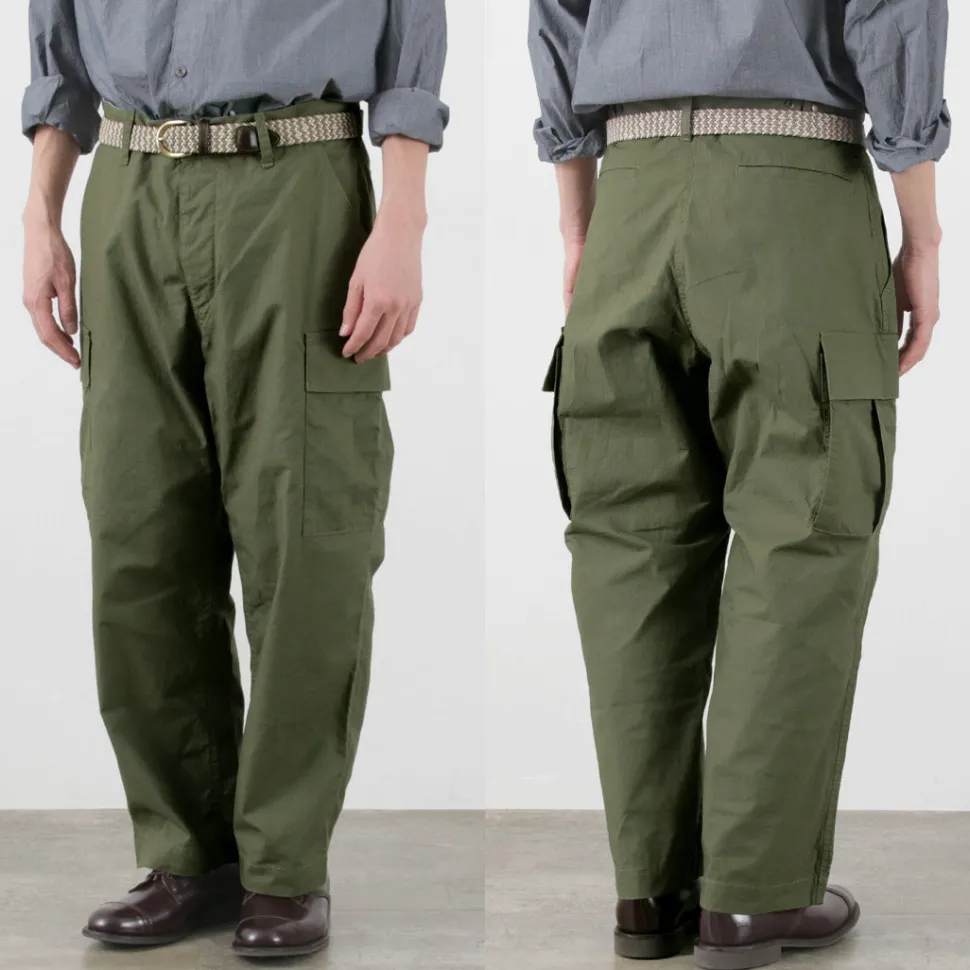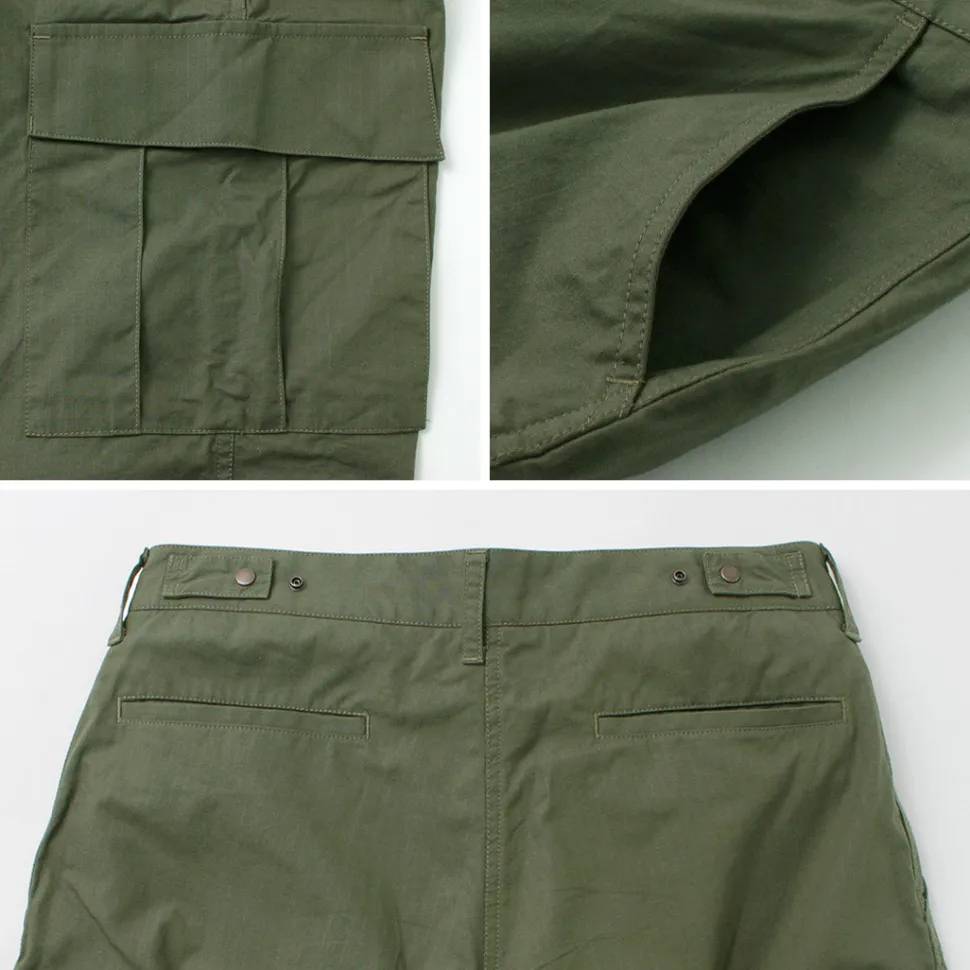 These cargo pants are made of a thin, durable 100% cotton ripstop fabric. The fabric is characterized by its crisp feel against the skin, and the lattice pattern gives them a military look.