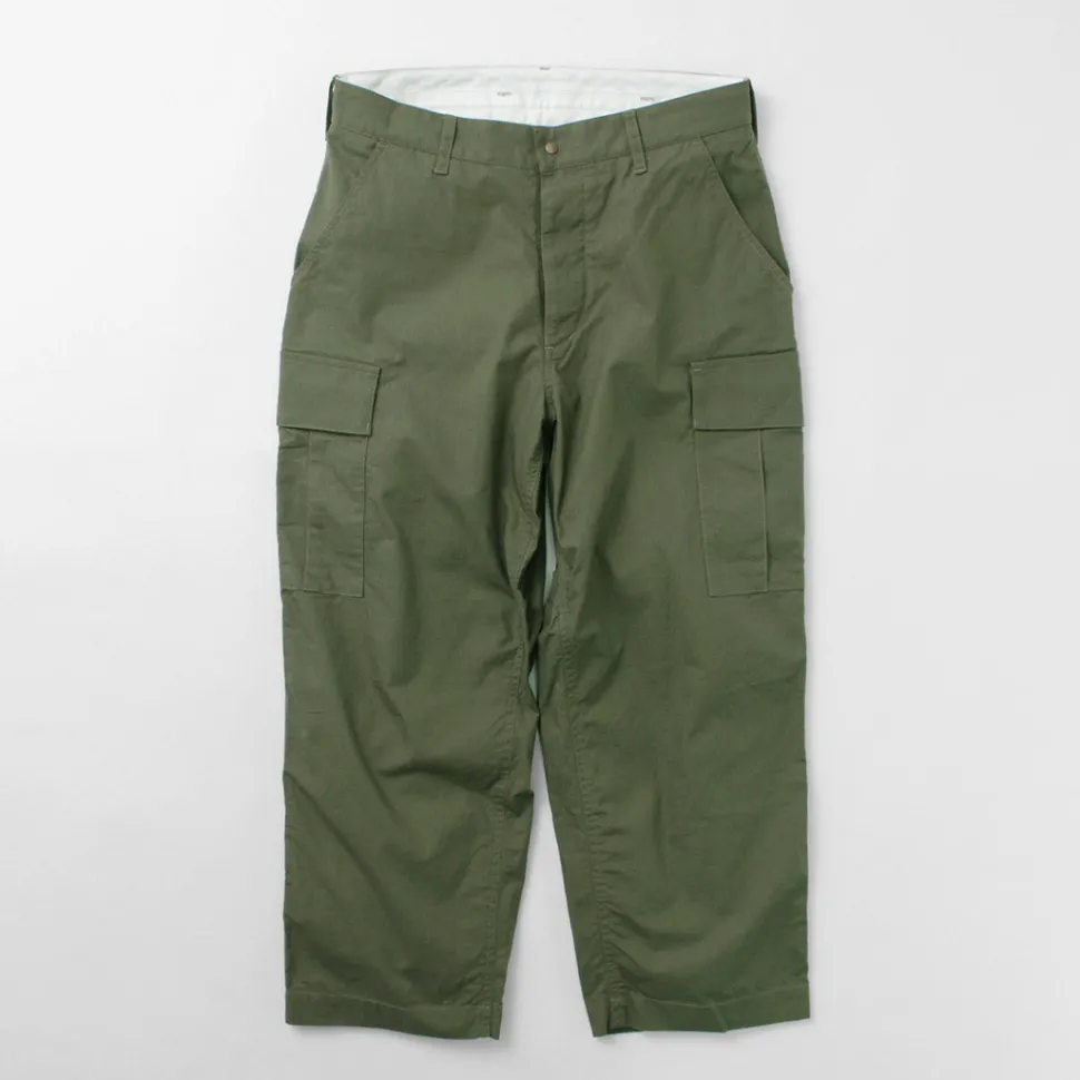 Side cargo pockets are gussetless to create a clean form. The hip pockets have been made simple to create a mild military-style cargo pants.