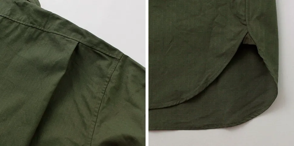 This shirt is made from durable ripstop fabric, often used in military wear. The fabric is woven with thicker threads in a grid pattern, making it resistant to snags and abrasions, ensuring long-lasting use.
