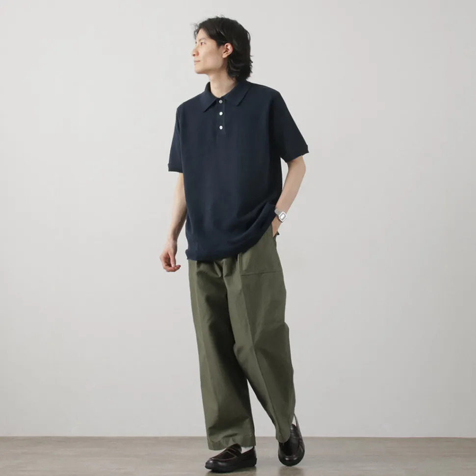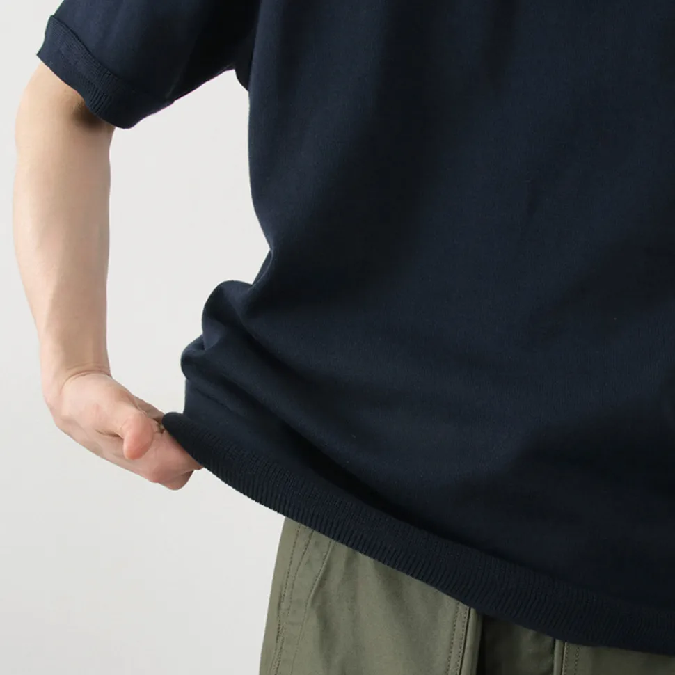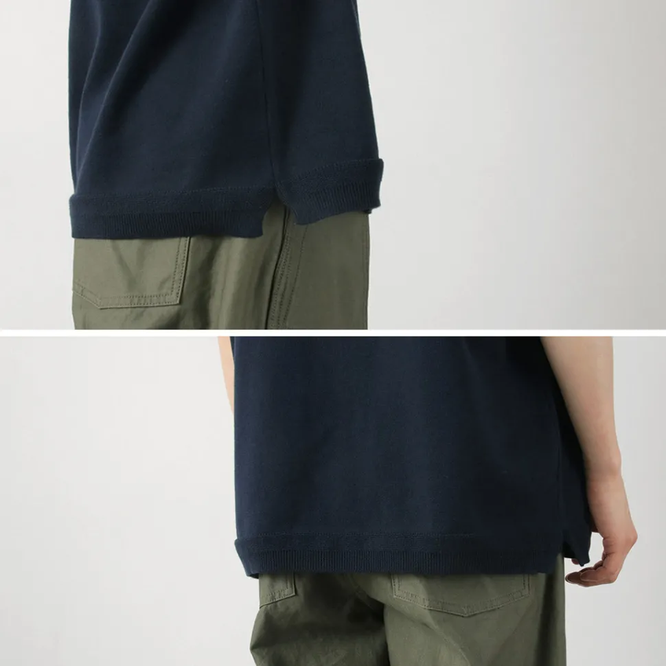 It is made of high-gauge cotton yarn in a jersey knit, and has just the right amount of elasticity, breathability, and moisture absorbency to make the most of the material. It also has a moderately loose silhouette and the unique feel of cotton, so you can relax and enjoy wearing it.