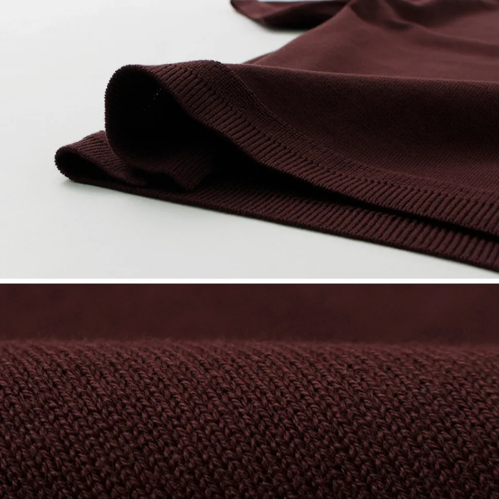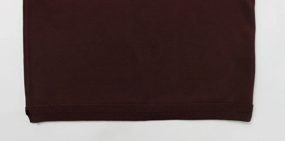 The fabric is knitted with extremely fine cotton at 12 gauges. The jersey-knit fabric is characterized by a slight sheen and smooth texture.