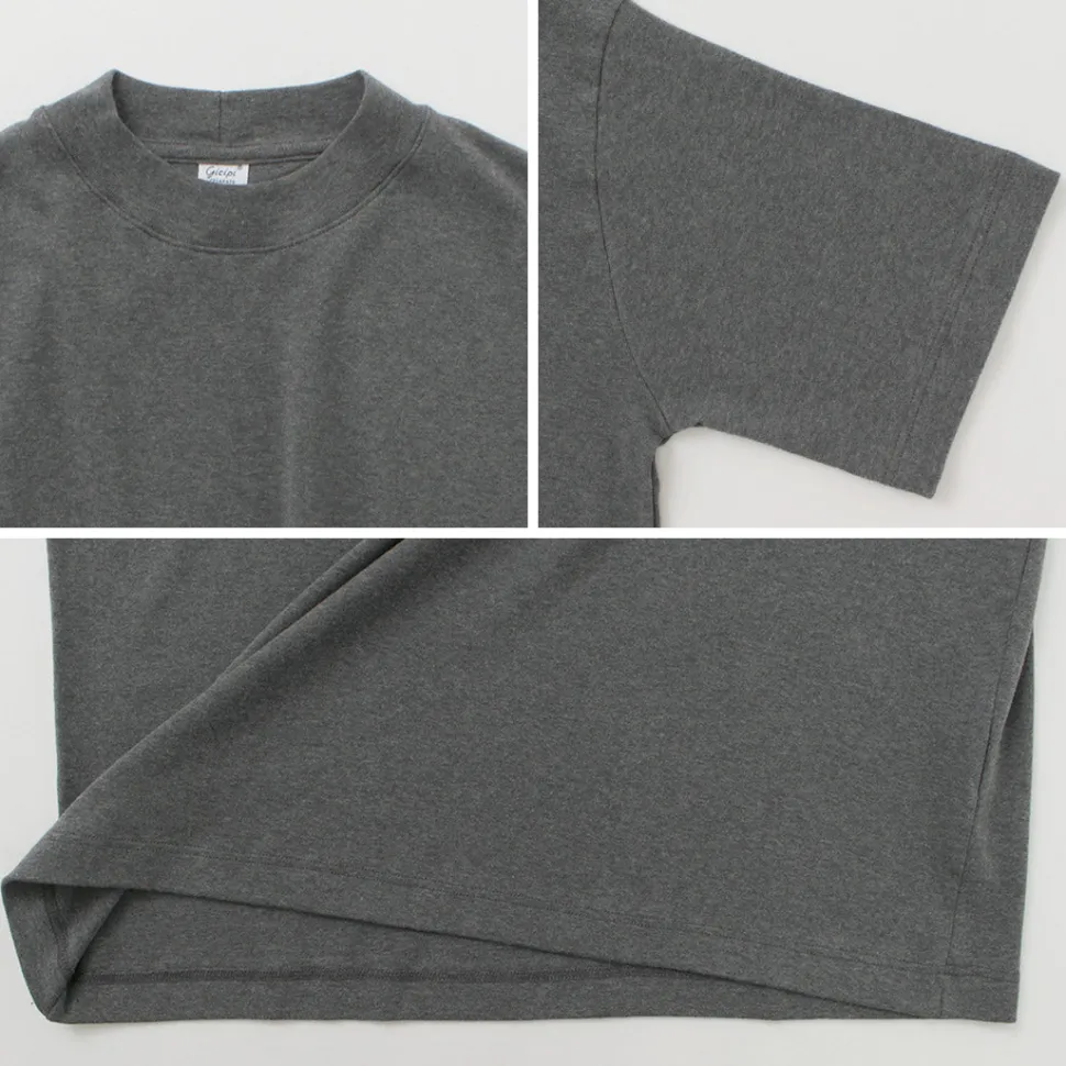 Features a mock neck with a moderate height. It offers the casualness of a crew neck tee while adding an elegance not found in regular crew neck tees.