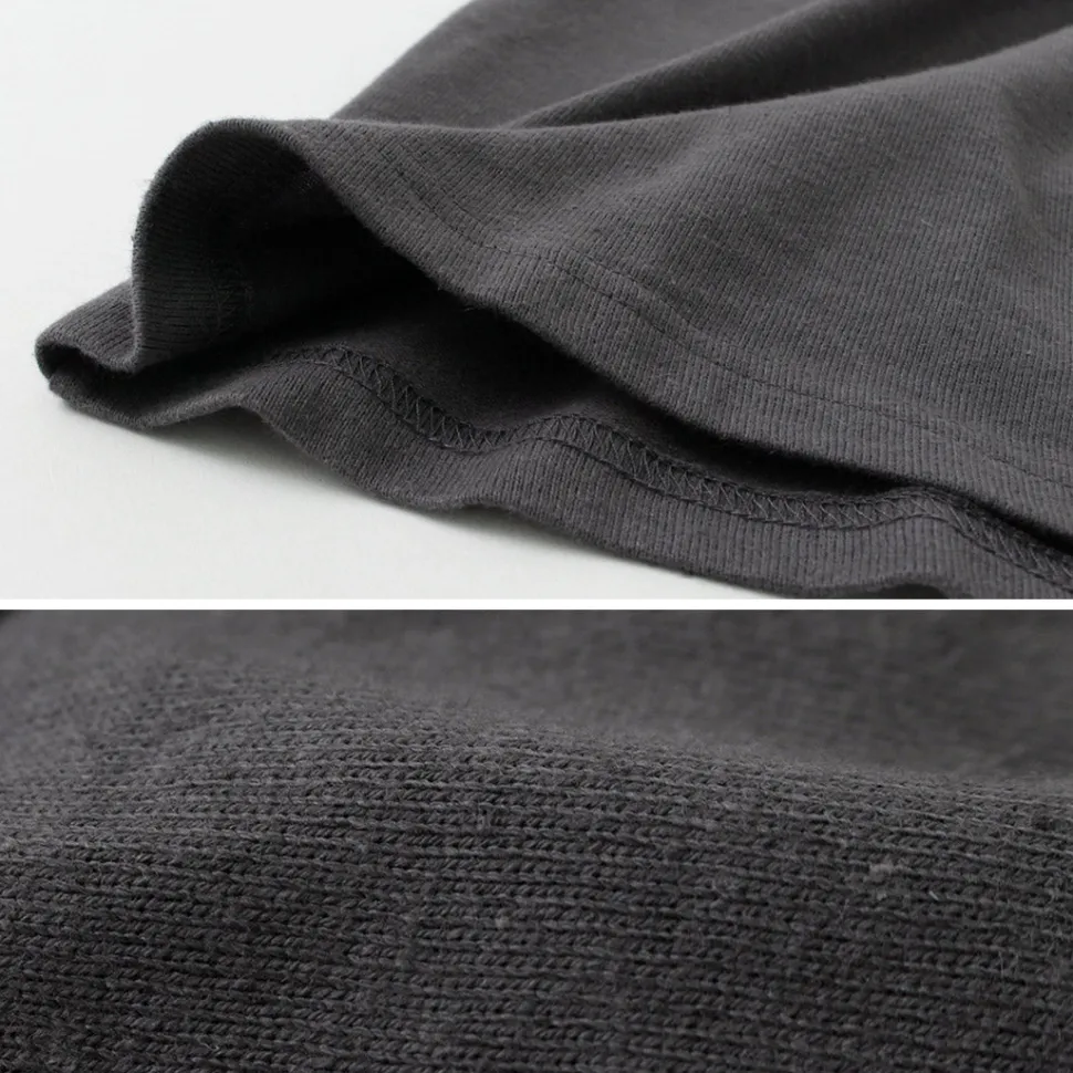The thickness of the fabric is thicker than that of a typical T-shirt, and it is hard to pick up body lines and is tough enough not to lose its shape.