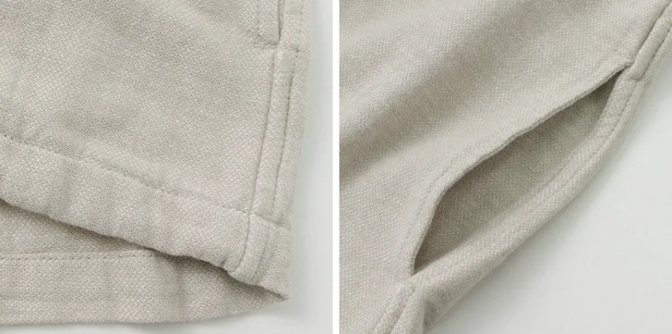 The Broken Twill fabric is a blend of hemp and cotton. The uneven weave gives it a smooth and silky texture that feels comfortable against the skin. The superior moisture absorption and quick-drying properties of hemp fabric make it comfortable to wear even during the sweaty season.