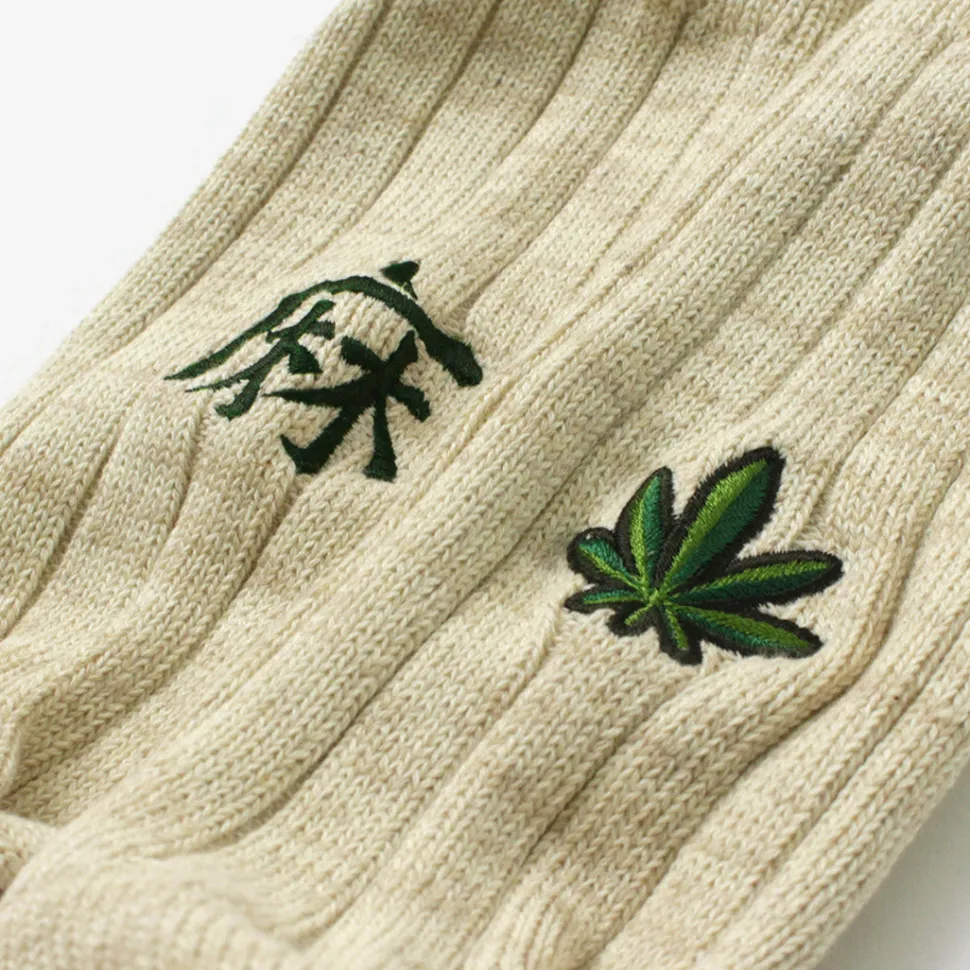 From the front, these crew socks appear to be conventional. However, their distinctive feature lies in the bold embroidery of the character “麻” (hemp) on the back.