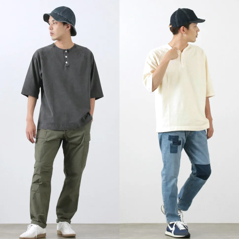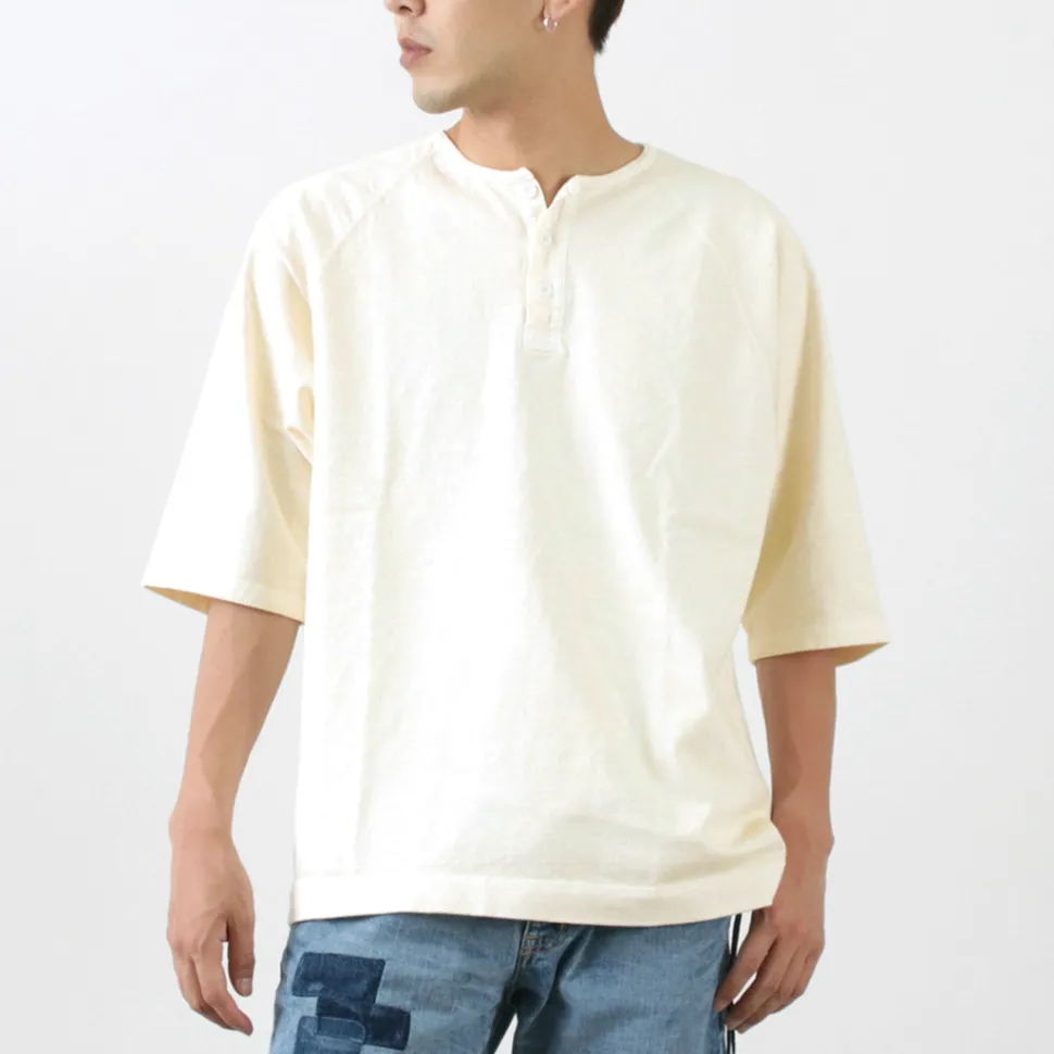 The neckline features a Henley neck with a fine binder. The Henley neck is named after the shirts worn by participants in the Henley Royal Regatta, a boat race held on the River Thames in London, and is a fashion detail with a long history. The placket uses woven fabric, adding to its charm. The sturdy sewing supports the heavyweight fabric, and the raglan sleeve design ensures ease of movement without feeling bulky.