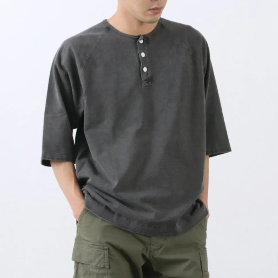 It features half sleeves of exquisite length and a retro henley neck design that is not too assertive. The raglan sleeve design and generous body width provide a comfortable fit.