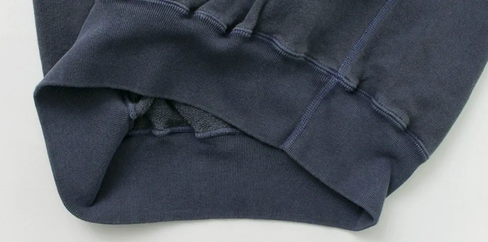 Made with soft, thick fabric and a smooth, dry texture typical of American-made cotton. Using 9oz French terry with a pile lining, the fabric is just the right thickness—not too thick, not too thin—offering excellent moisture absorption and moderate warmth, allowing you to wear it throughout the seasons.
