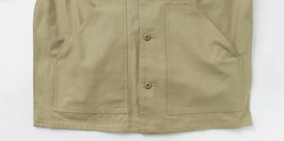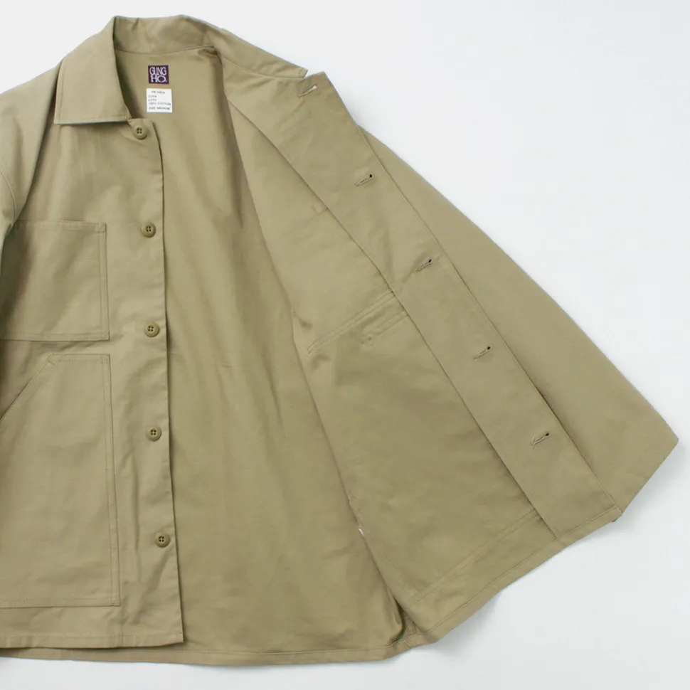 The Fatigue Cover Jacket is an updated version of a classic jacket that has been produced in the GUNGHO USA since the 1990s. This one combines elements of military fatigues jackets with coveralls, and features large utility pockets and a box silhouette. The fabric is made of Japanese back satin. It has firmness and forms a three-dimensional silhouette when worn, making it a comfortable item to wear.