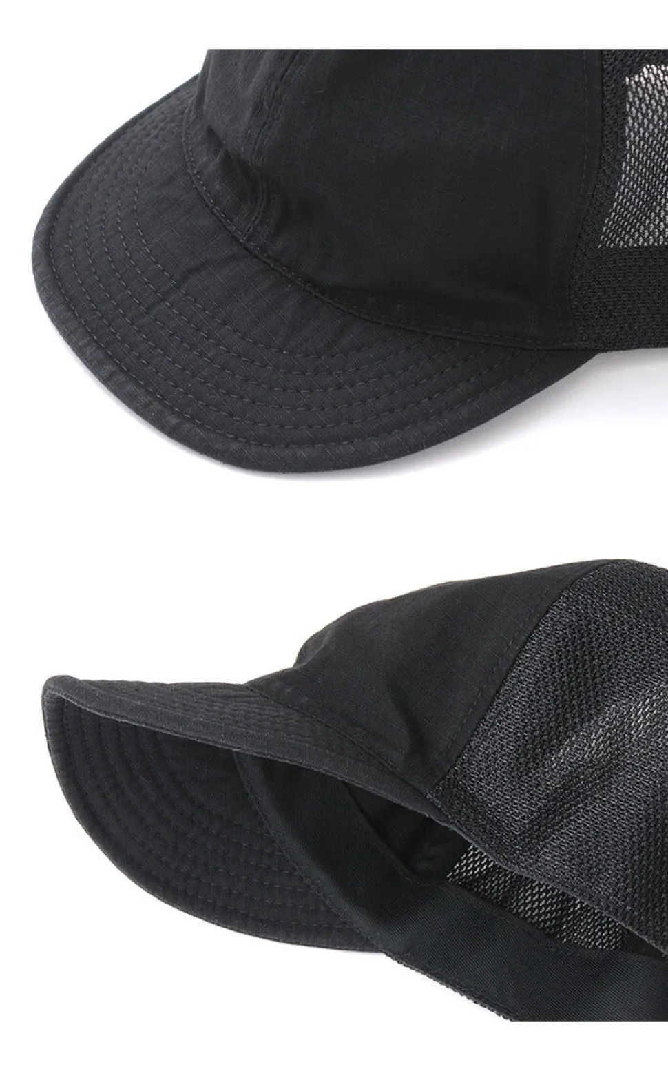 Mesh material is added to high-density, water-repellent cotton nylon ripstop fabric. This cap is breathable and lightweight, and can be worn easily in summer.