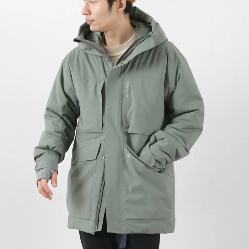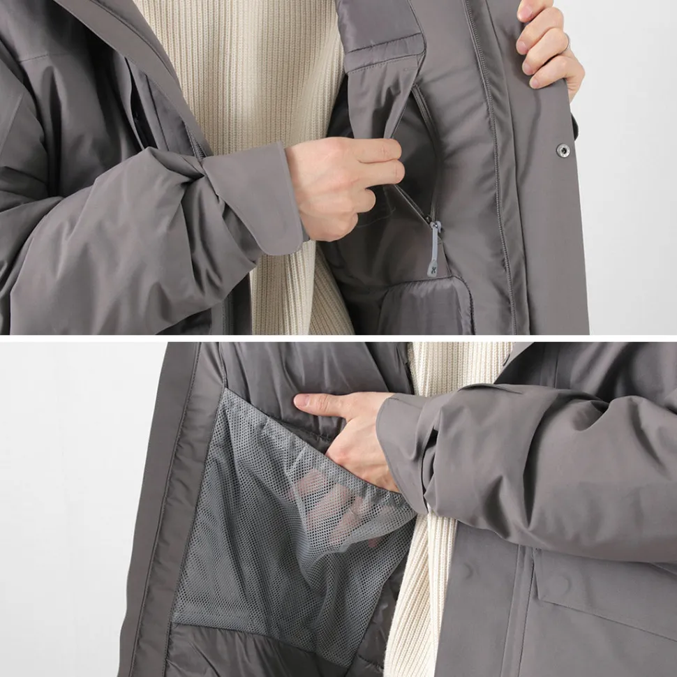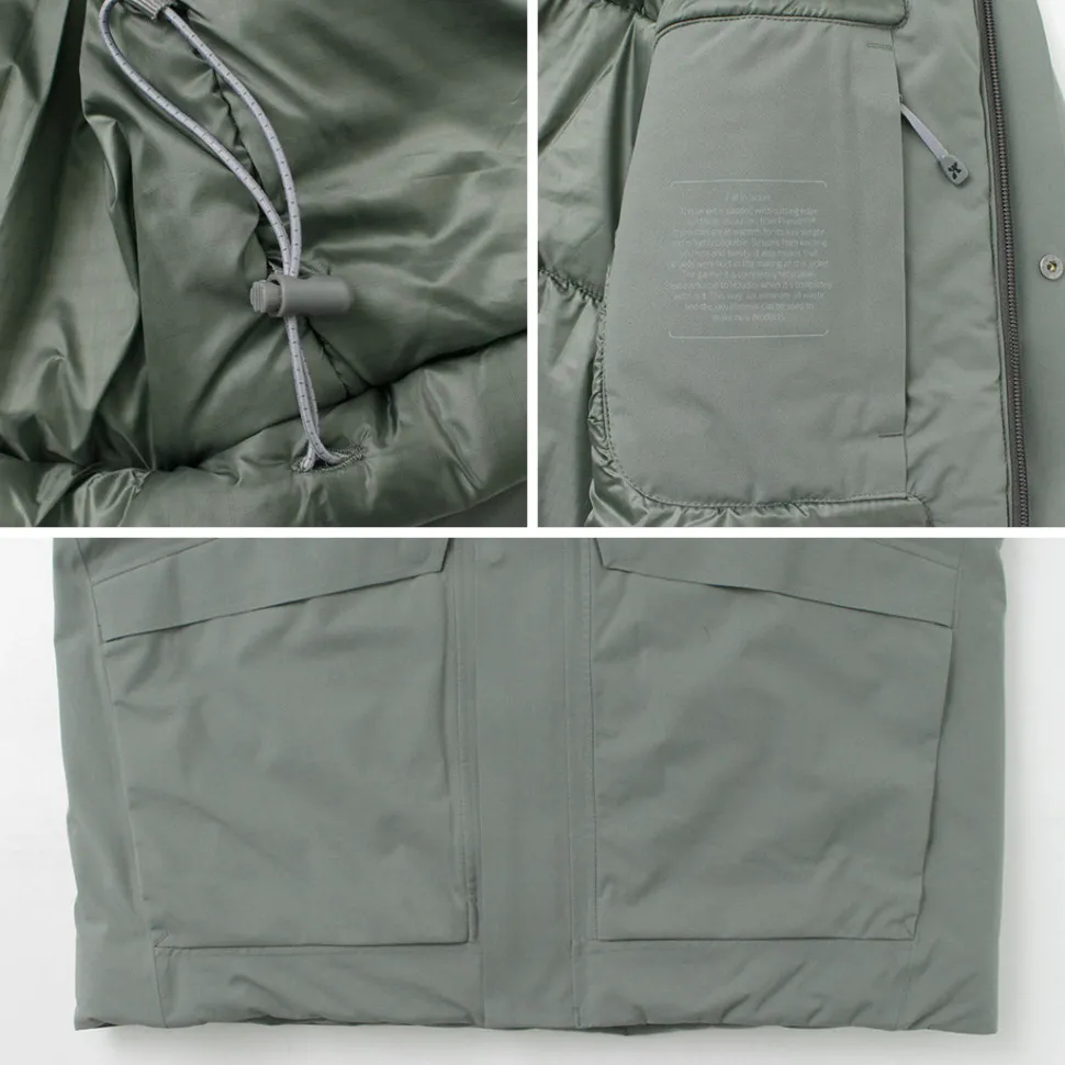 By zipping up the topmost part of the zipper, it securely covers up to the chin, providing excellent warmth. It also features drawcords on the hood, neckline, and hem for easy fit adjustment.