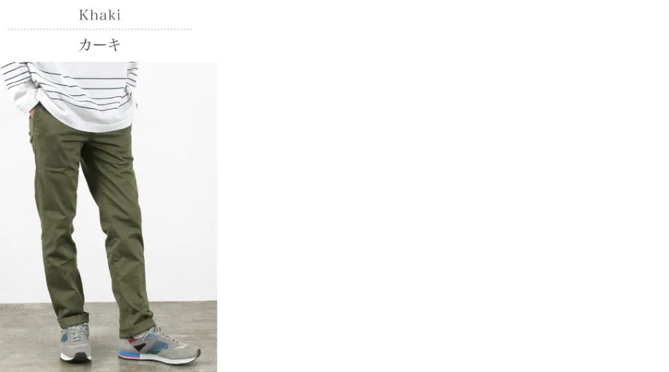 The fabric has excellent durability and can be worn on a daily basis without concern. The thickness is standard chino thickness, so it can be used in all seasons. While the silhouette is tight, the stretchy fabric provides excellent comfort.