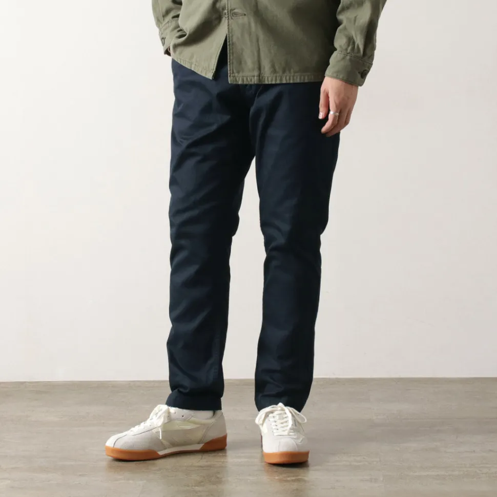 The tapered silhouette is characterized by a considerably wider hip and armpit setting, and a sharply tapered shape from the knee to the hem. Even sportsmen with strong thighs can easily wear these chinos.