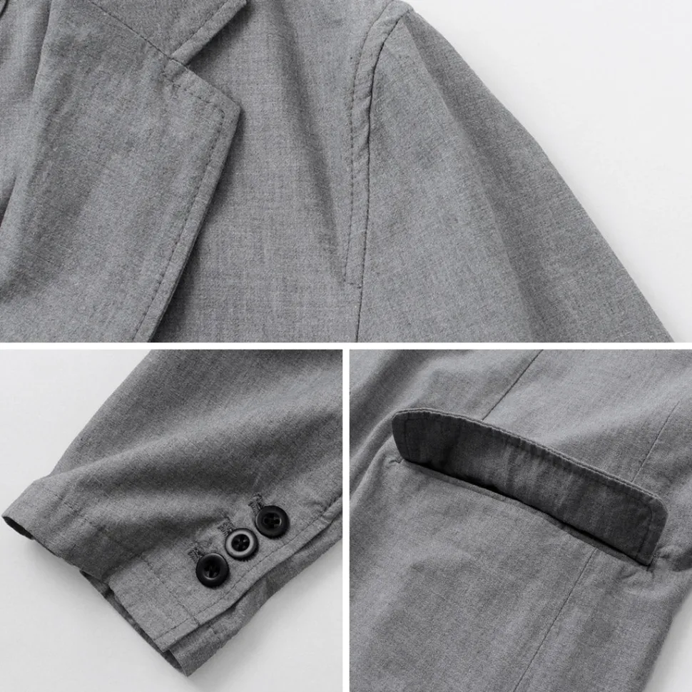 Simple two-button design with a classic notched lapel collar. The pocket flaps can be in or out.
