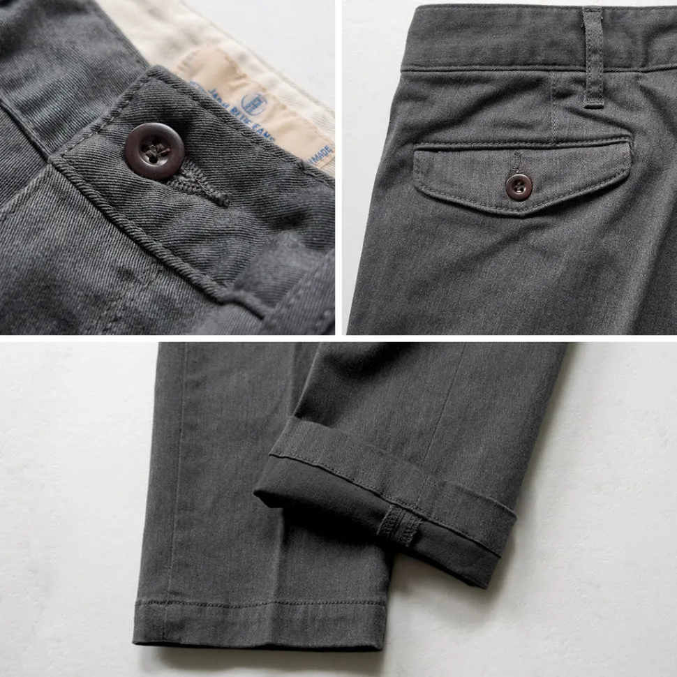 Inspired by U.S. military officer trousers, it features a flap on the left back pocket while the right pocket has a welt design, creating a balanced and distinctive back style.
