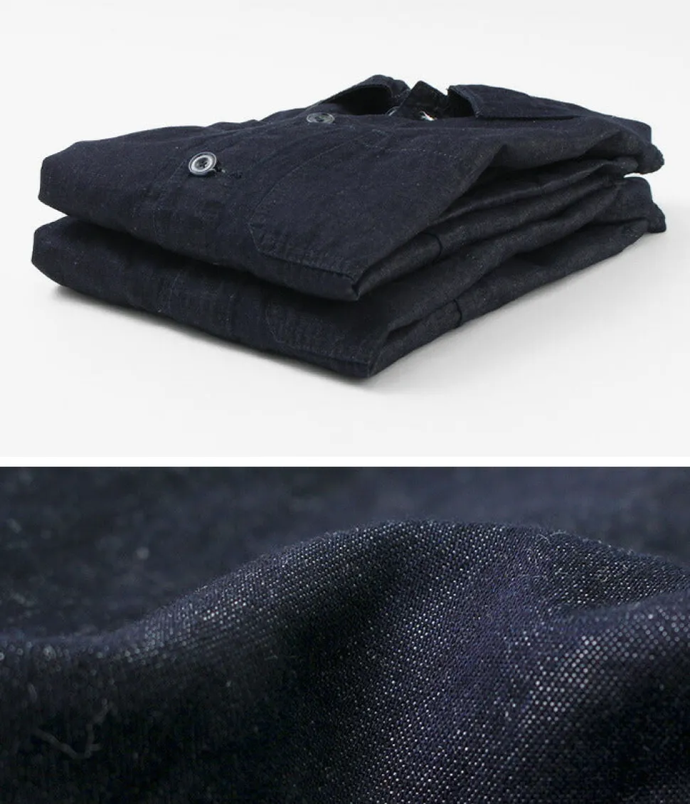 Based on a French work jacket, this piece is made of cotton linen denim fabric. The supple and resilient texture and the elegant look and feel come from the glossy expression.