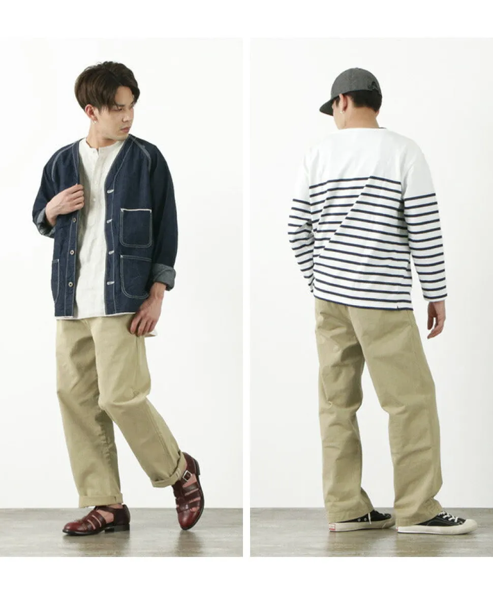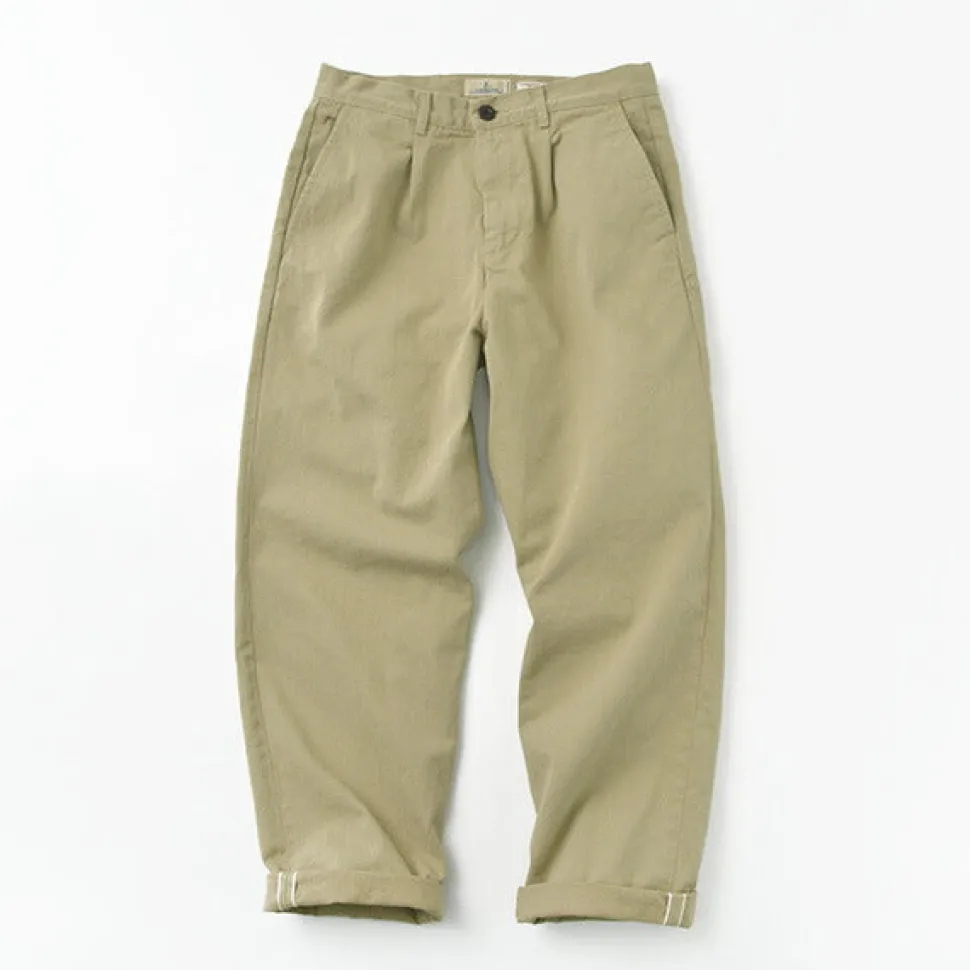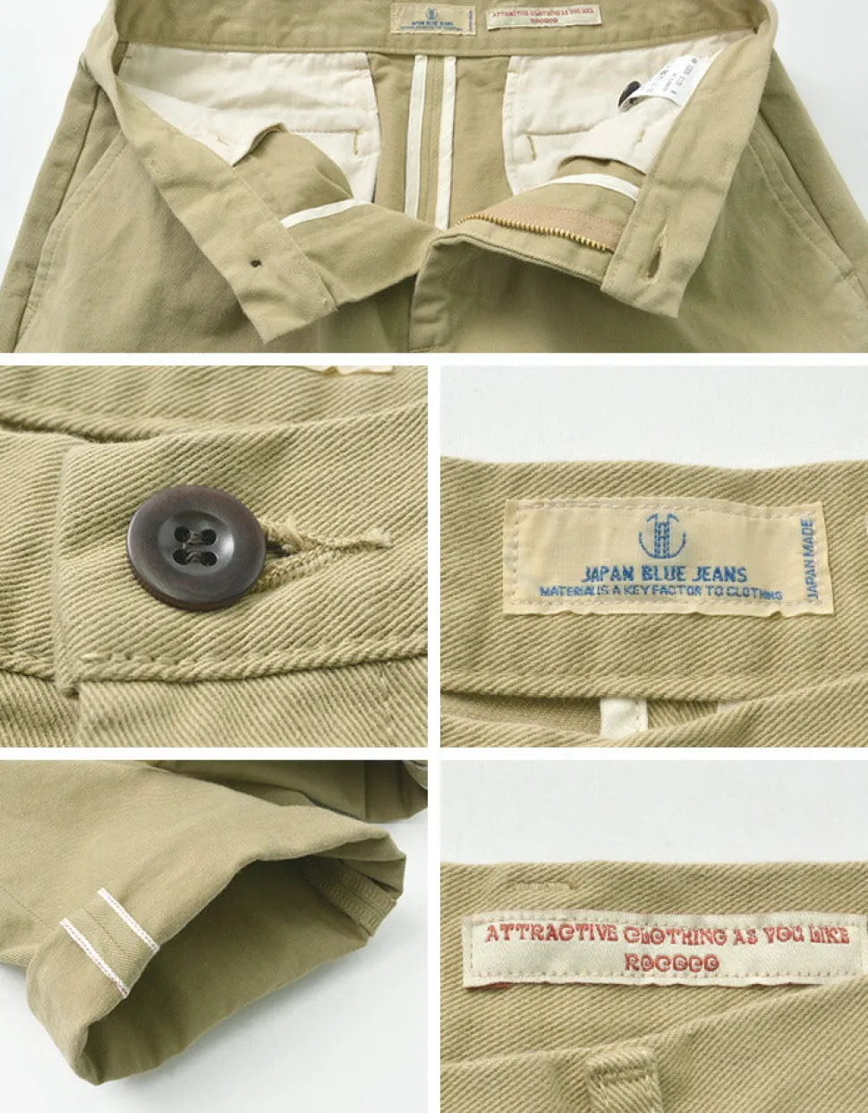 thickly woven selvedge chino has a supple and firm feel despite its stiffness. The natural unevenness of the fabric develops as the trousers are worn in.
