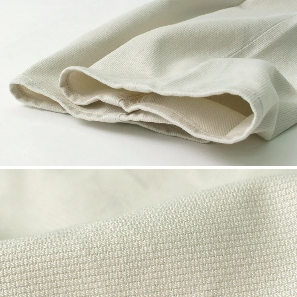 Pique is a special fabric with a plain weave on the surface and a twill weave on the reverse side. The warp yarns in the twill weave are woven so tightly that the surface rises, creating ridges that give the fabric its unique look. In addition, piqué is extremely tough with little stretch when worn, and its moderate thickness allows it to be enjoyed regardless of the season.