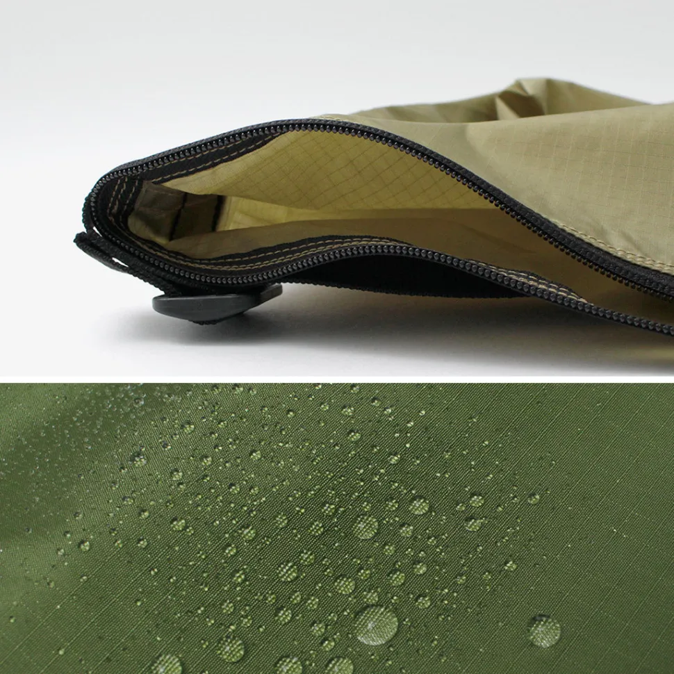 The fabric is made from ripstop nylon, woven in a grid pattern. This lightweight yet strong material is resistant to tears and is commonly used in tents and sleeping bags, offering exceptional durability. The subtly glossy matte fabric is also water-resistant, making it suitable for sudden weather changes during outdoor activities. It is designed to be used in a variety of situations.