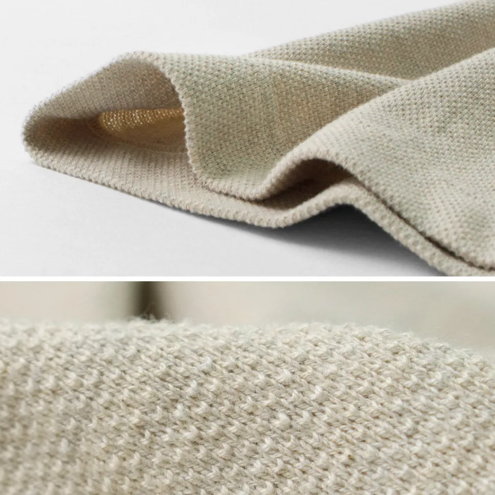 This item is made of a moss stitches fabric knitted with raffia yarn, inspired by the fabric used by the Swedish military. The fabric is characterized by its strong unevenness and dry touch to the skin, making it smooth and comfortable to wear even during the sweaty season.
