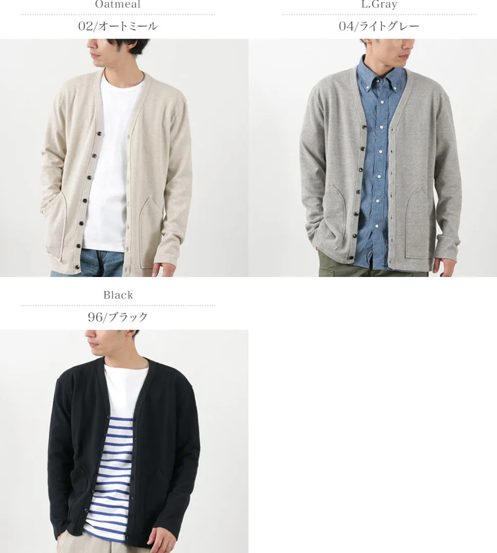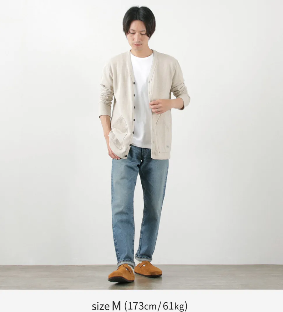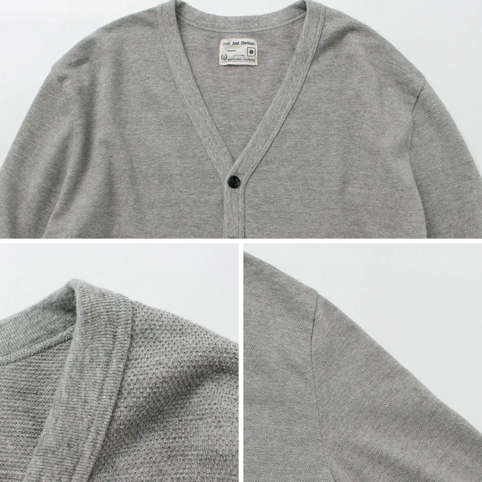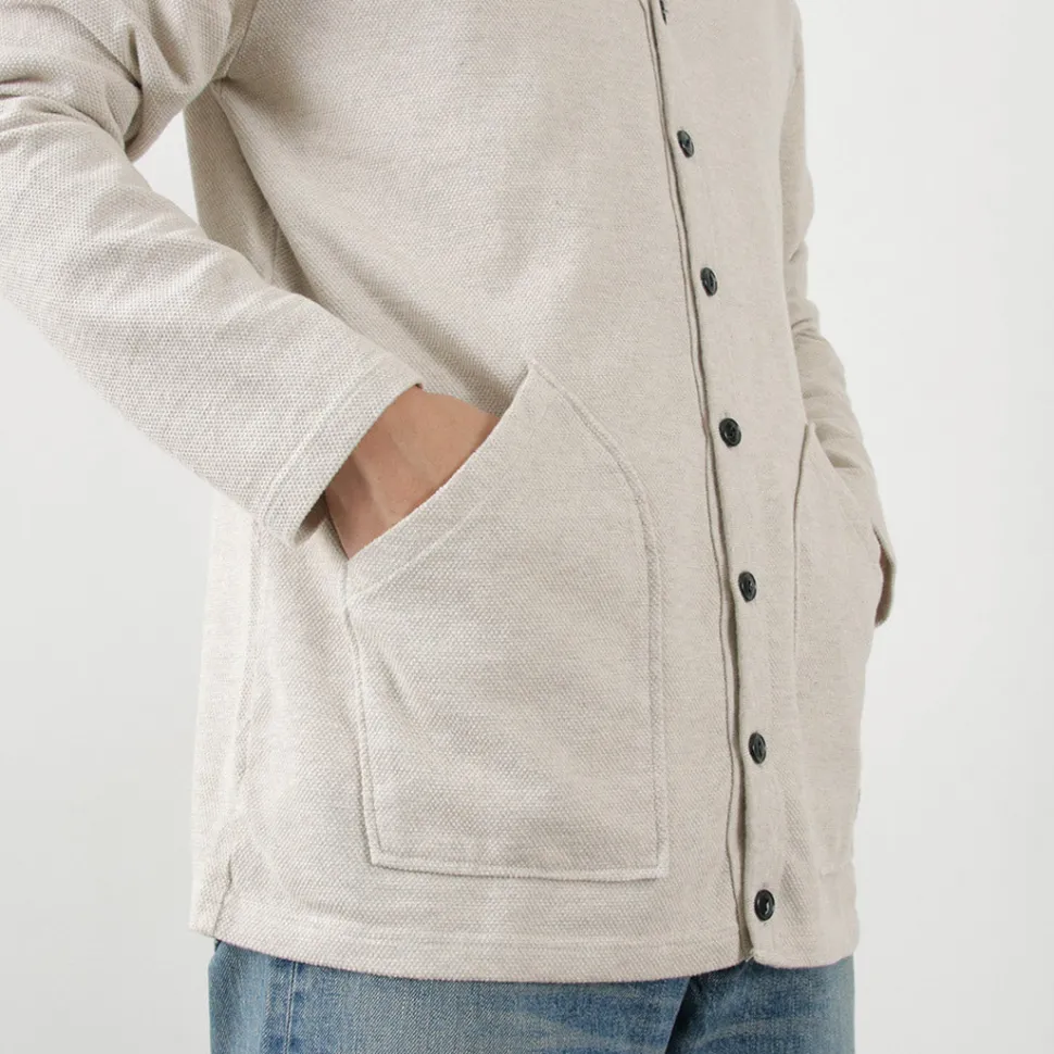 This cardigan is made of Kanoko(Pique) fabric, which is characterized by its strong unevenness and dry touch against the skin. The fabric has a strong, uneven texture and has a dry feel against the skin.