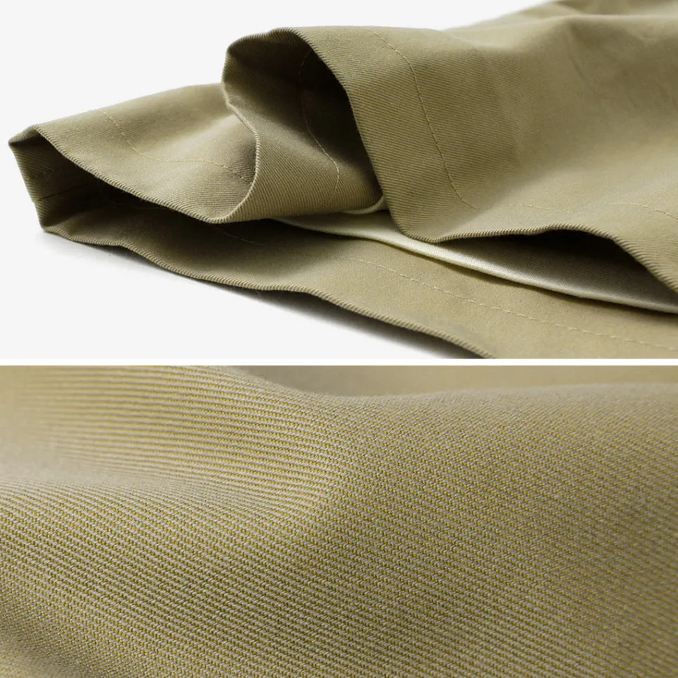 The material is yarn-dyed cotton gabardine cloth. It is characterised by an iridescent sheen with different colours in the warp and weft and a supple texture.