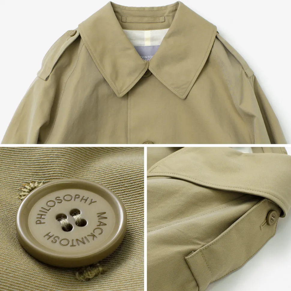 The motorcycle coat on which the design is based was created in France around 1940 for use by the army. It is a type of military coat that originated in France around 1940 for use by the army. As the name suggests, it has an oversized silhouette designed to be worn in layers by motorbike troops.