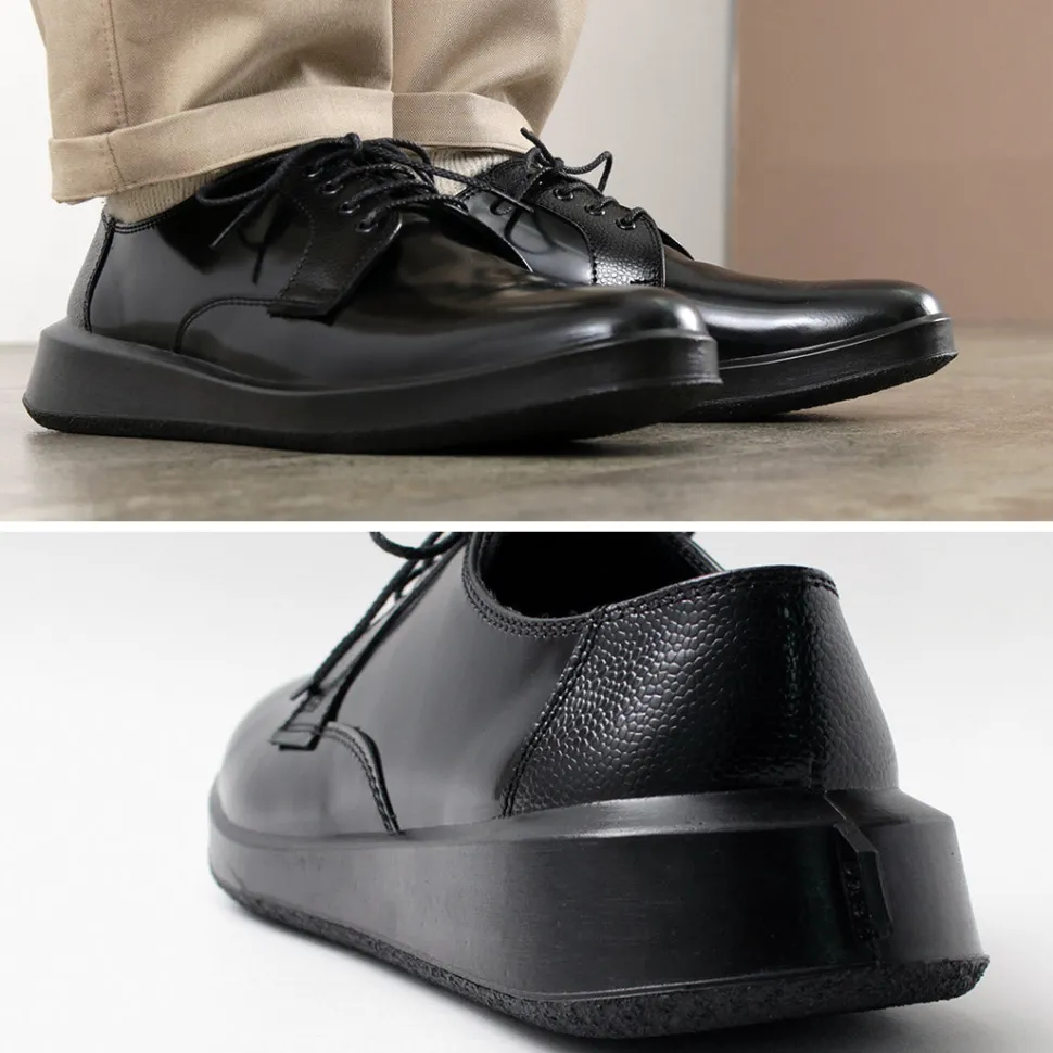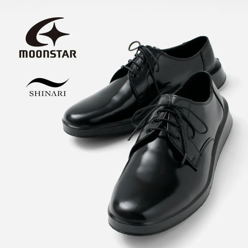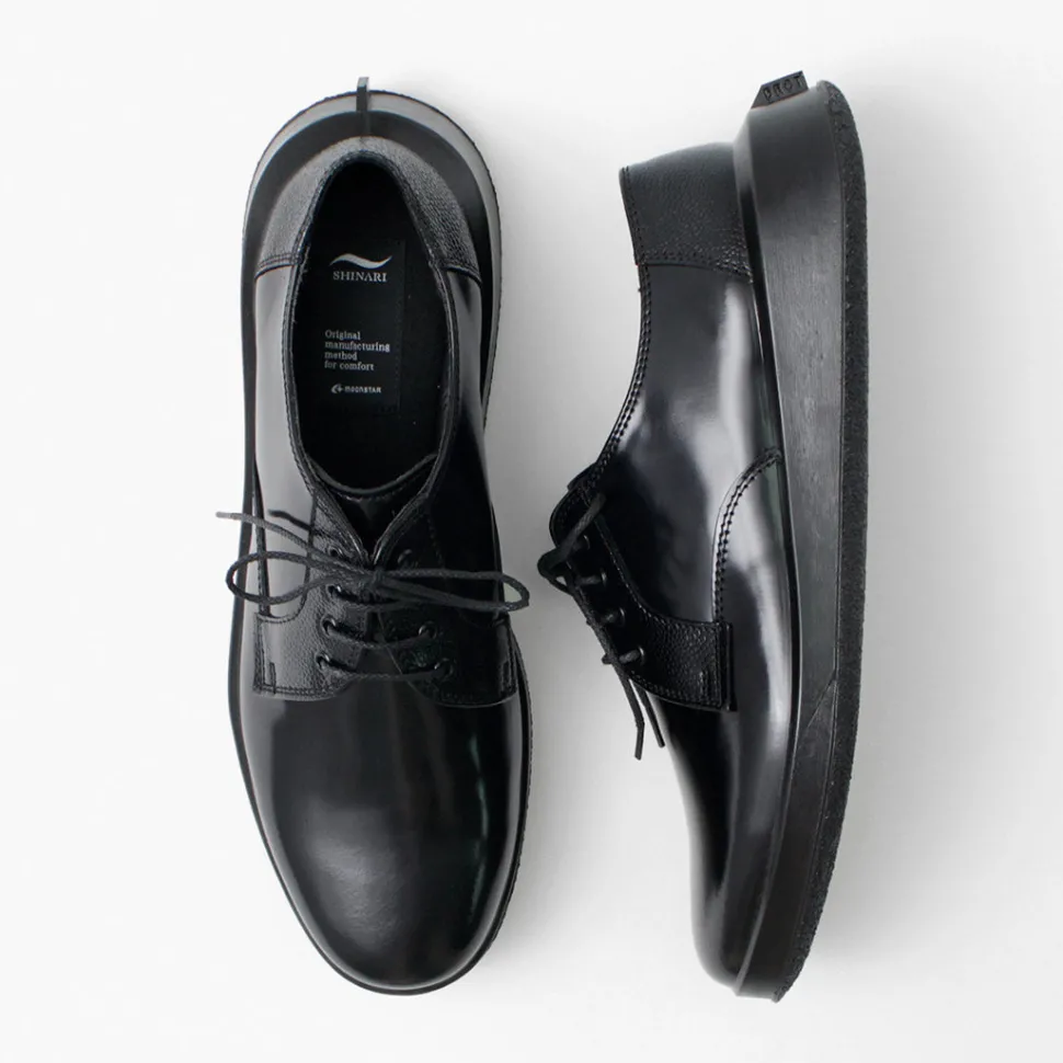 “SHINARI” is a new line of shoes from MOONSTAR. This series incorporates design elements from MOONSTAR’s archives, mainly leather shoes, into a unique sole shape that creates cushioning by flexing the outsole. The simple derby-plain “SUMEN (bare surface)” is a pair that is elegant with its characteristic feather stitching and overlapping patterns, yet comfortable and easy on the feet.