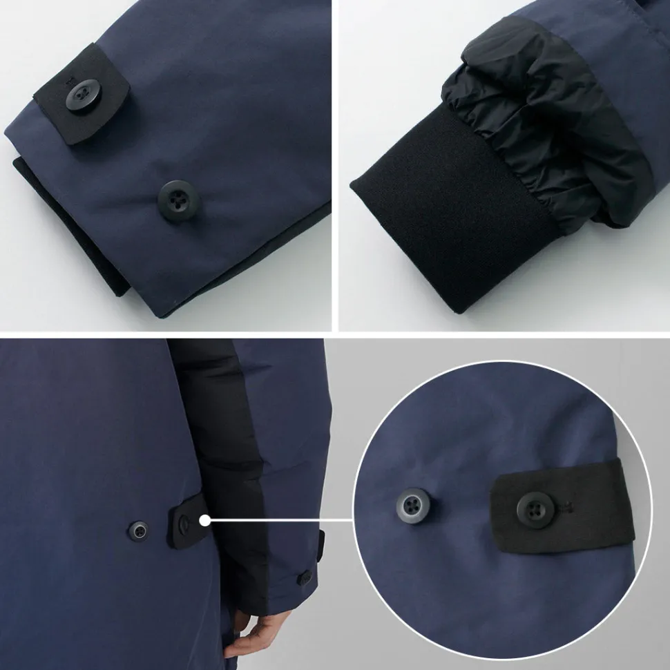 The cuffs are equipped with ribbed inner cuffs to block cold air from entering through the cuffs. A belt at the waist allows you to change the silhouette.