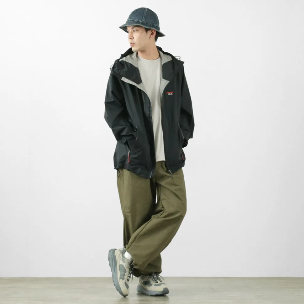 Overall, not too wide, not too narrow, not for the wearer Silhouette. The shoulder area has raglan sleeves for ease of movement. The drawcord at the hem can be tightened for a different silhouette.